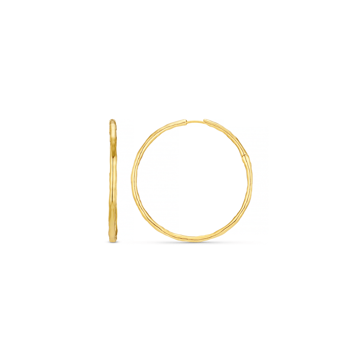 These large hoop earrings are crafted from 100% recycled brass with a polished molten texture. They have a 49mm diameter, a 3mm width, and a 51mm height. They are non-returnable unless faulty.