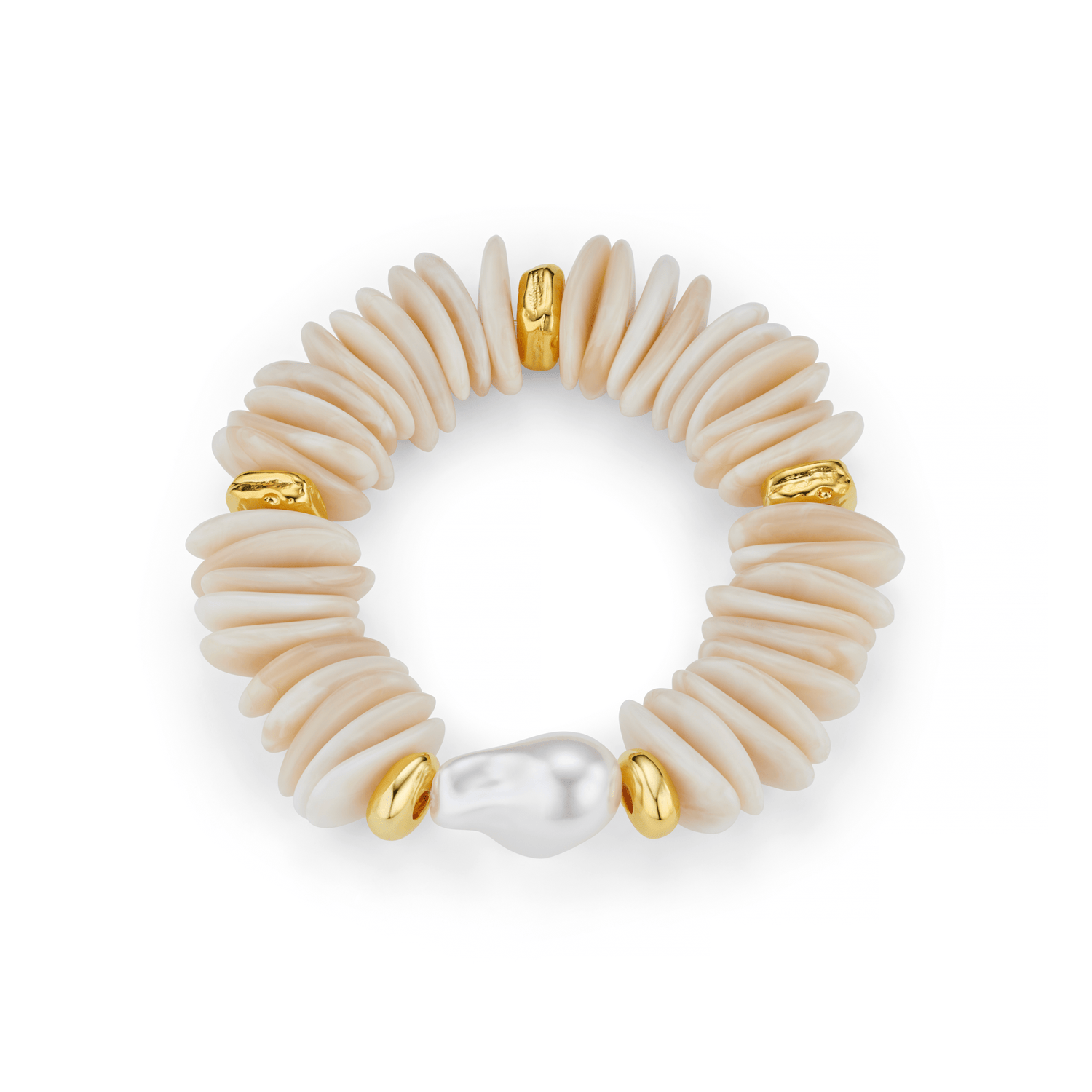 This Statement Chip & Stationed Pearl Bracelet by Orelia London is a unique and bold accessory for summer. It combines shell-inspired chip accents, separated by gold-plated beads, and is finished with a timeless stationed faux pearl. This piece creates a captivating contrast of textures and shines that elevates any look. Perfect for those who love the beach, it can be layered with other bracelets or worn on its own as a standout piece.