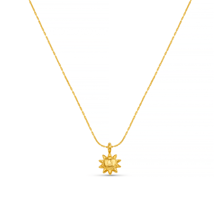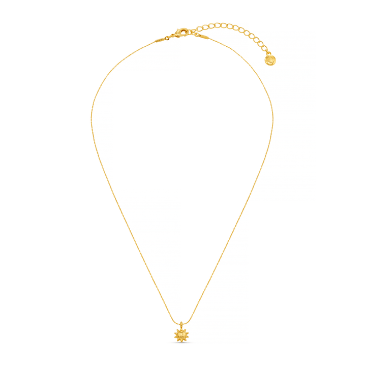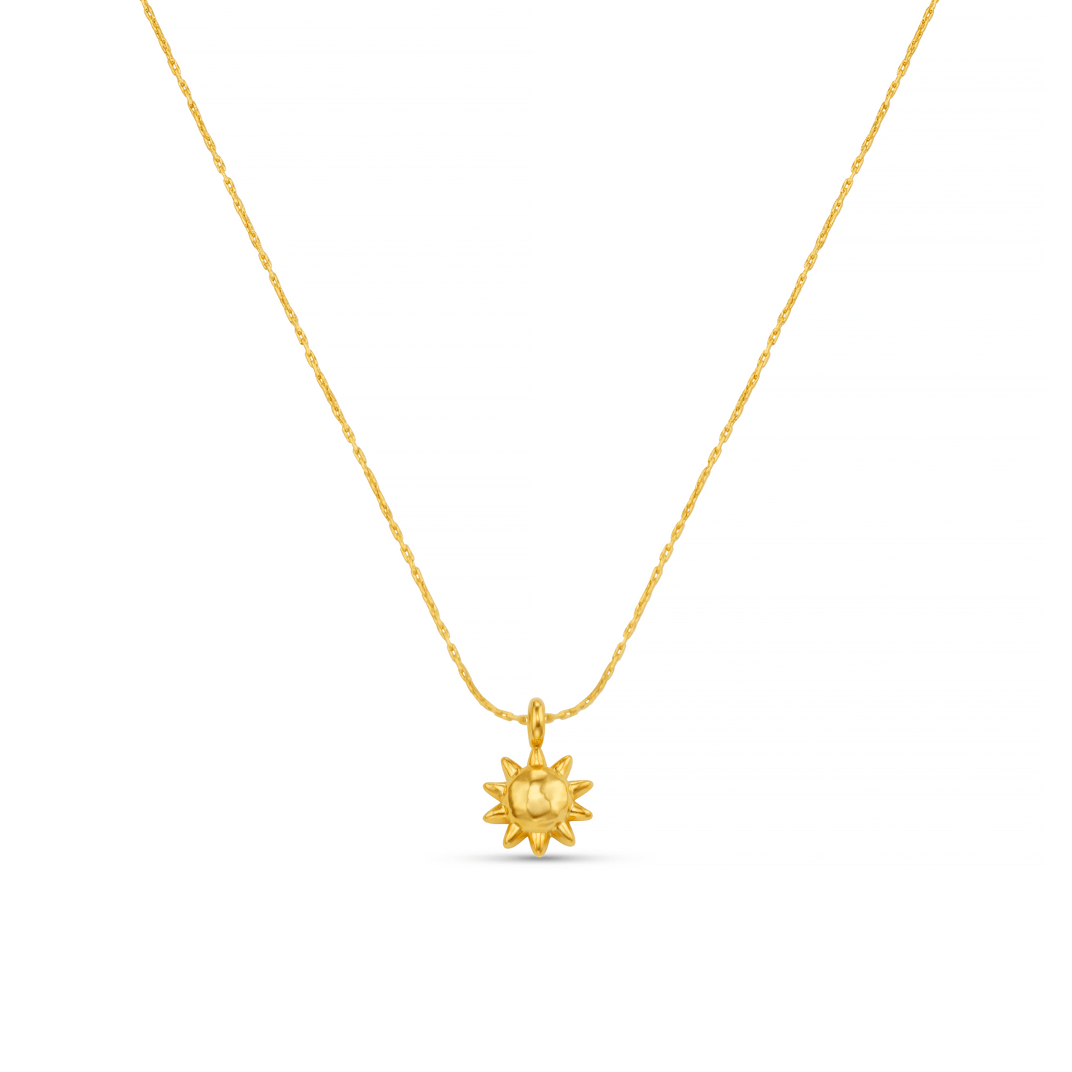This necklace is made from 90% brass chain and 10% recycled brass. It measures 38cm with a 5cm extender, and the sun charm is 7mm in width and 8mm in height.
