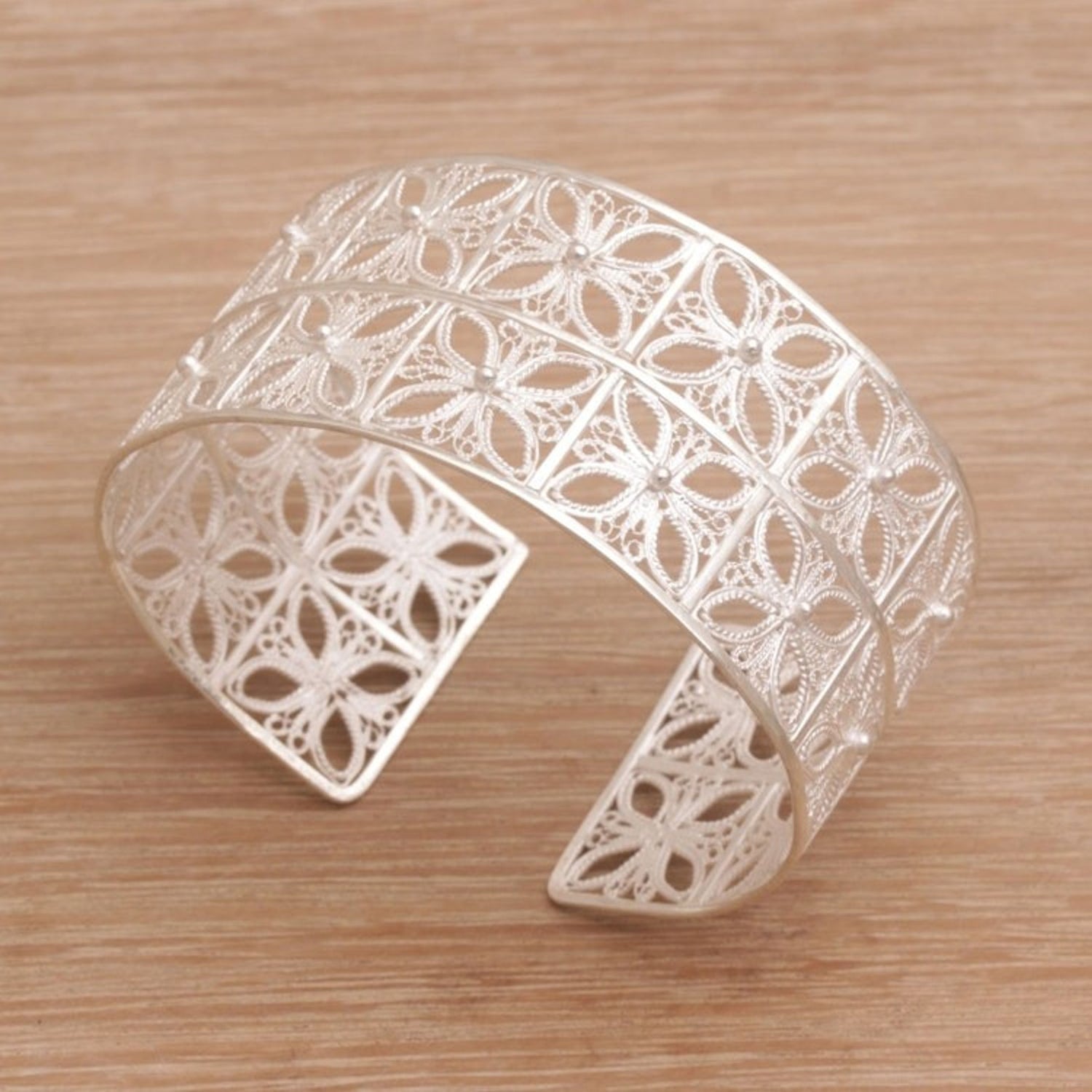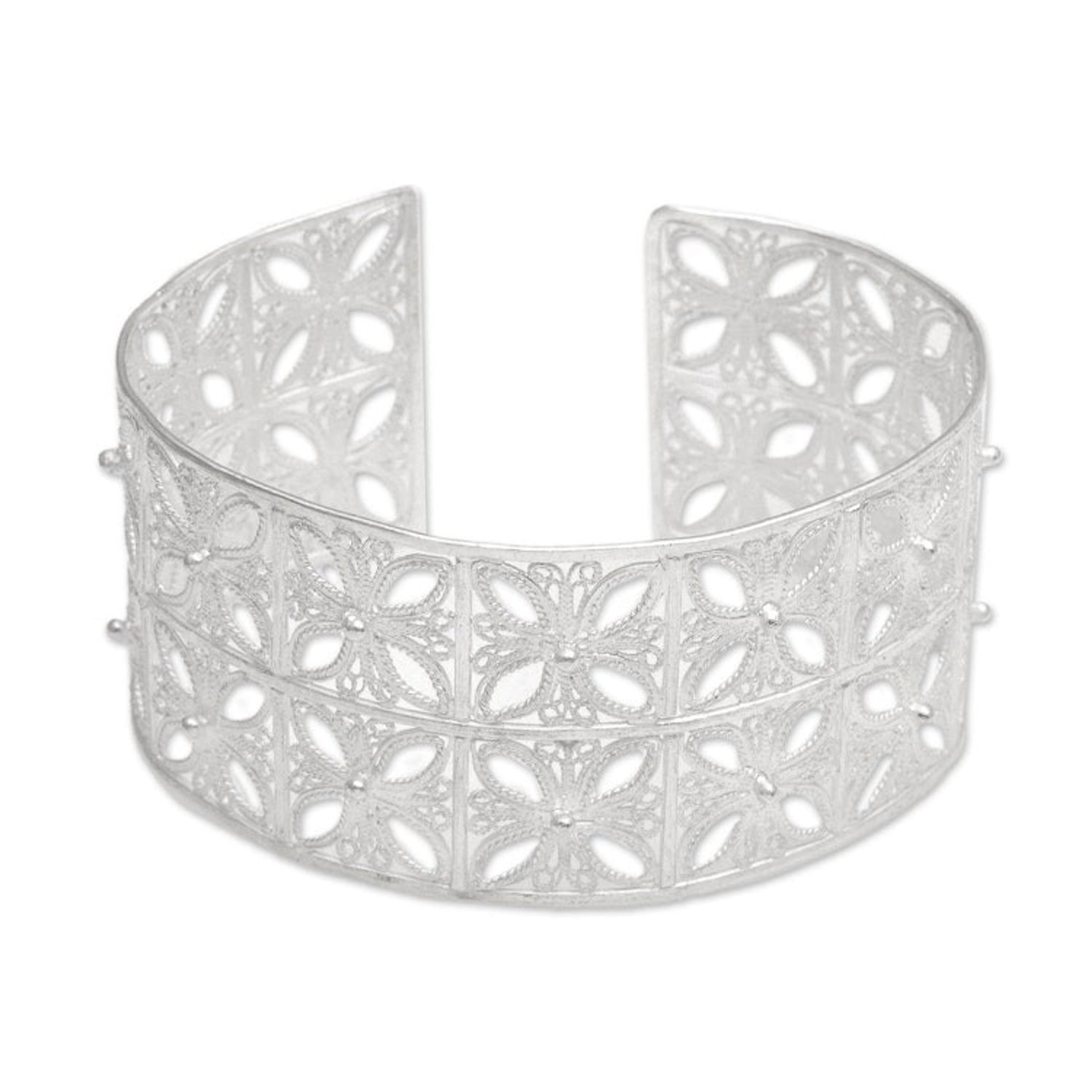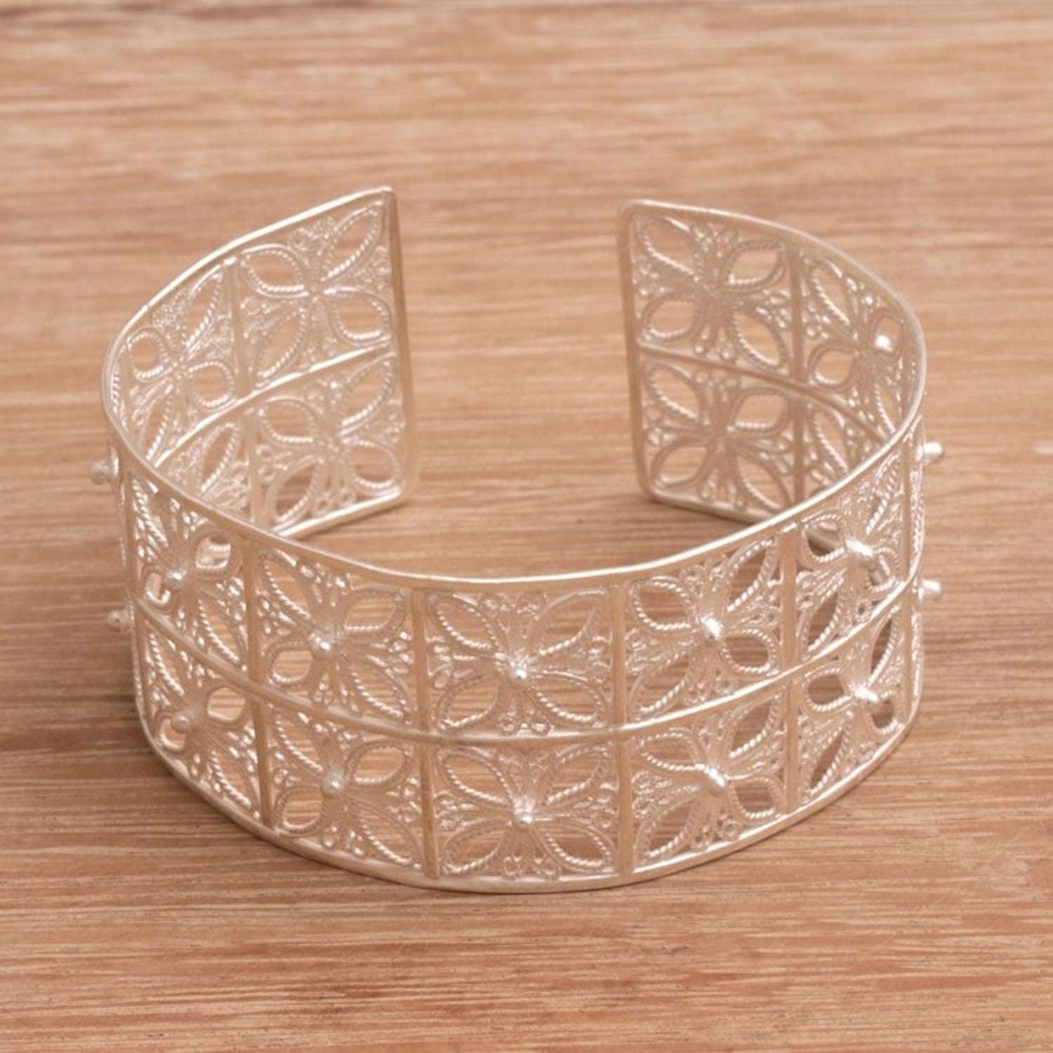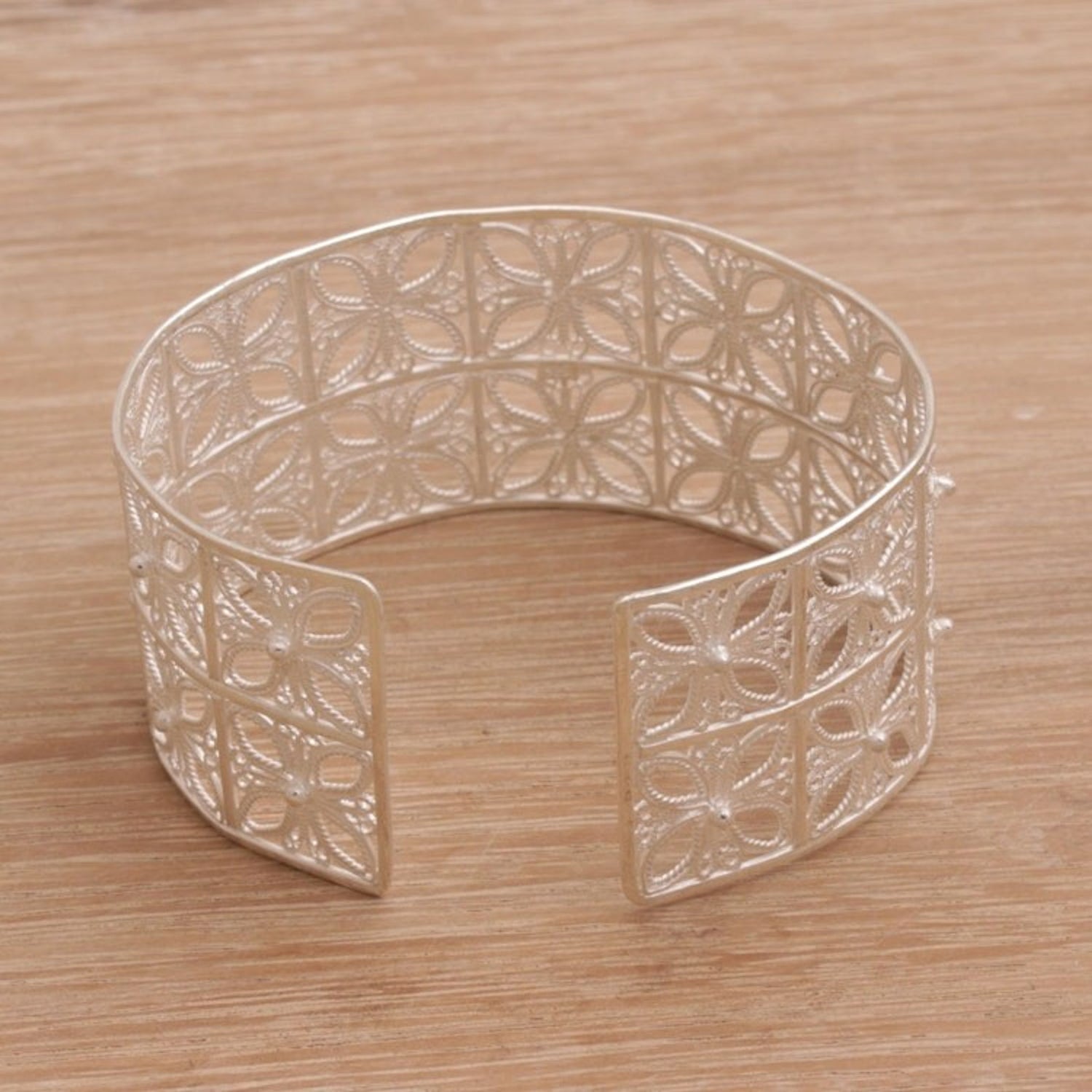 The 'Song of Java' cuff bracelet by Antarina Putik Hadian is a stunning piece that honors Javanese craftsmanship. The artisan designs this sterling silver cuff with a recurring petal motif and intricate filigree openwork. The handcrafted accessory glistens with a high polish finish, highlighting the delicate pattern of a square containing four petals on a curving double band.