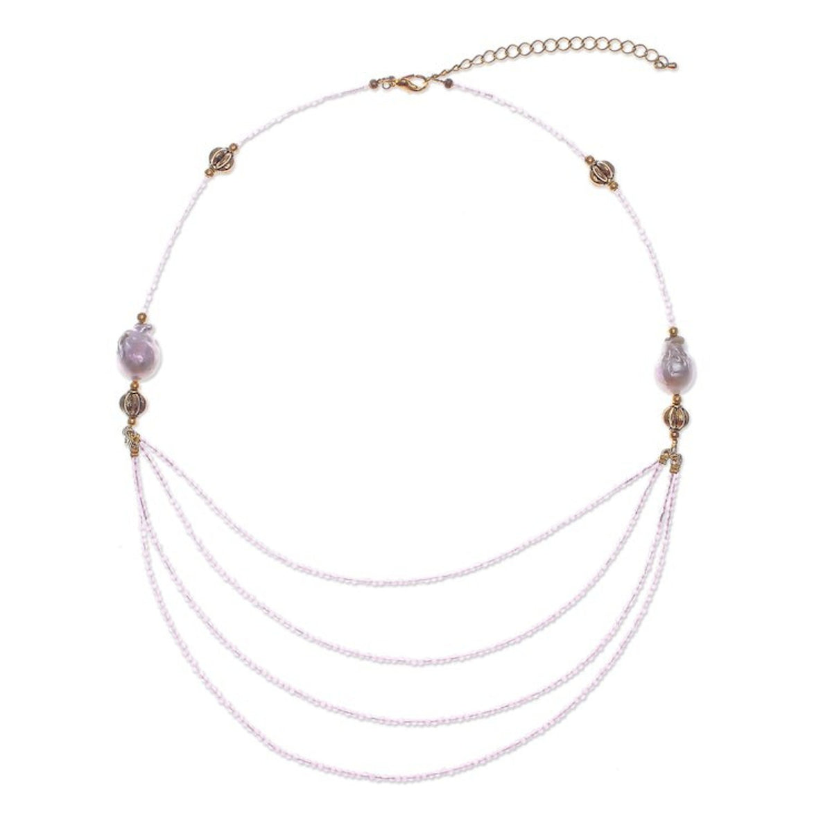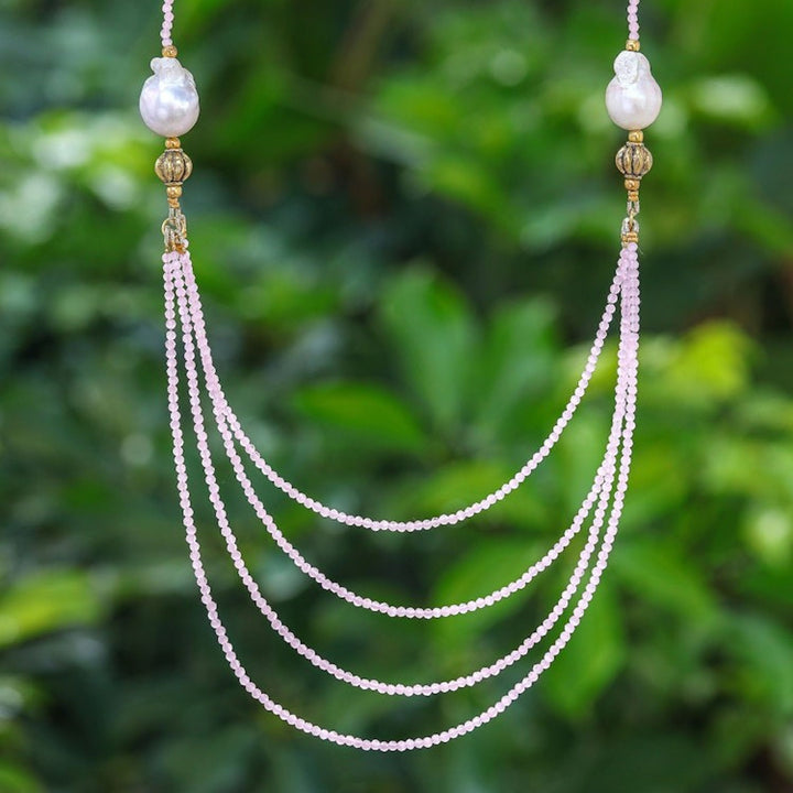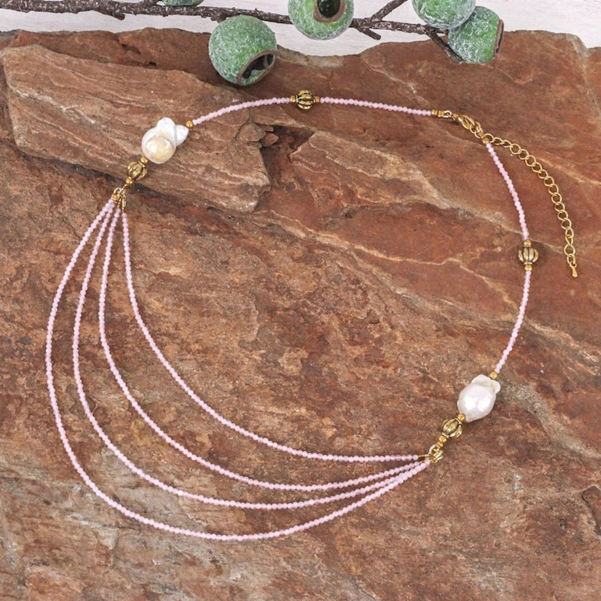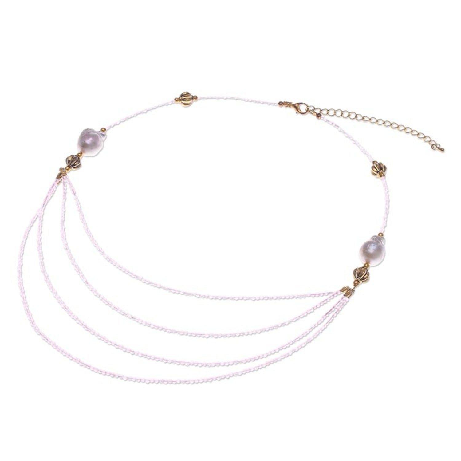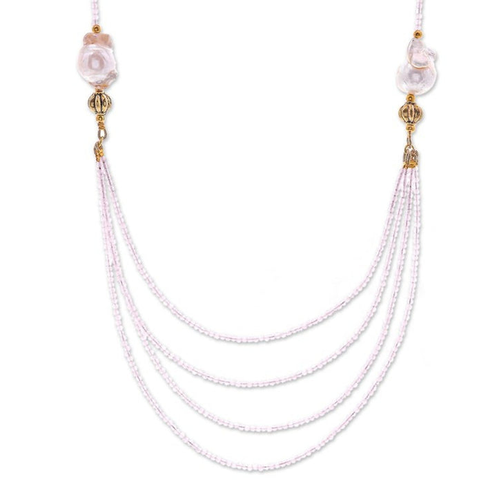 Arshad Ullah's 'Icy Shores in Pink' pendant necklace is a charming design with a glowing touch. The Thai artisan combines glamorous rose quartz stones with white cultured pearls in a unique, four-strand arrangement. 18k gold-plated brass accents add a luxurious finish, creating a piece that can complement any outfit.