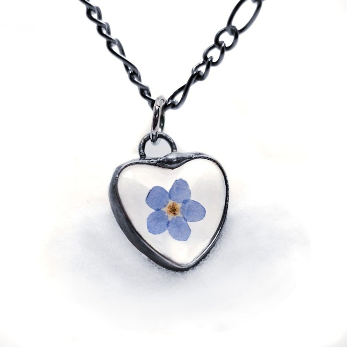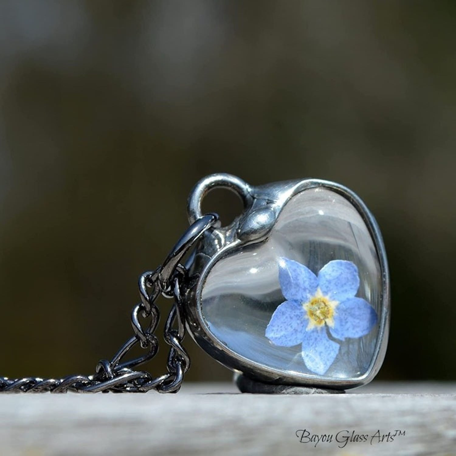 The 'Forget-Me-Not Heart Charm Necklace' by Bayou Glass Arts is a wonderfully feminine and dainty piece. The artisan encases a tiny, delicate, dry-pressed Forget Me Not flower in a heart-shaped glass charm. Each piece is unique due to the natural variations in the flower, making it a special, one-of-a-kind gift.