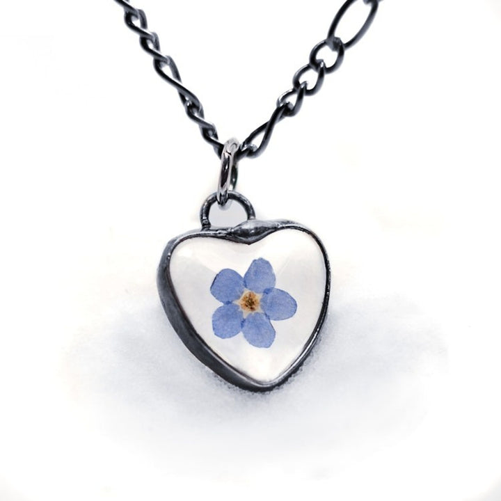 Handcrafted in the USA, this necklace features a glass heart charm with a real pressed Forget Me Not flower. The charm measures 3/4 inch H x 1/2 inch W. It is available in Gunmetal or Shiny Silver finishes and comes with an adjustable figaro chain.