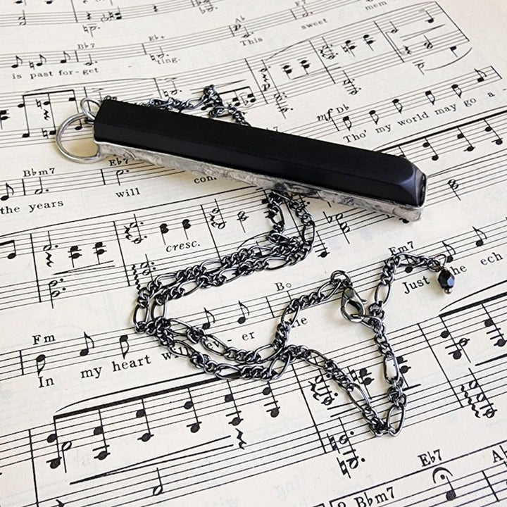 Handcrafted in the USA, this pendant is made from a genuine ebony wood piano key with a silver-toned metal frame. It is also available as a keychain.