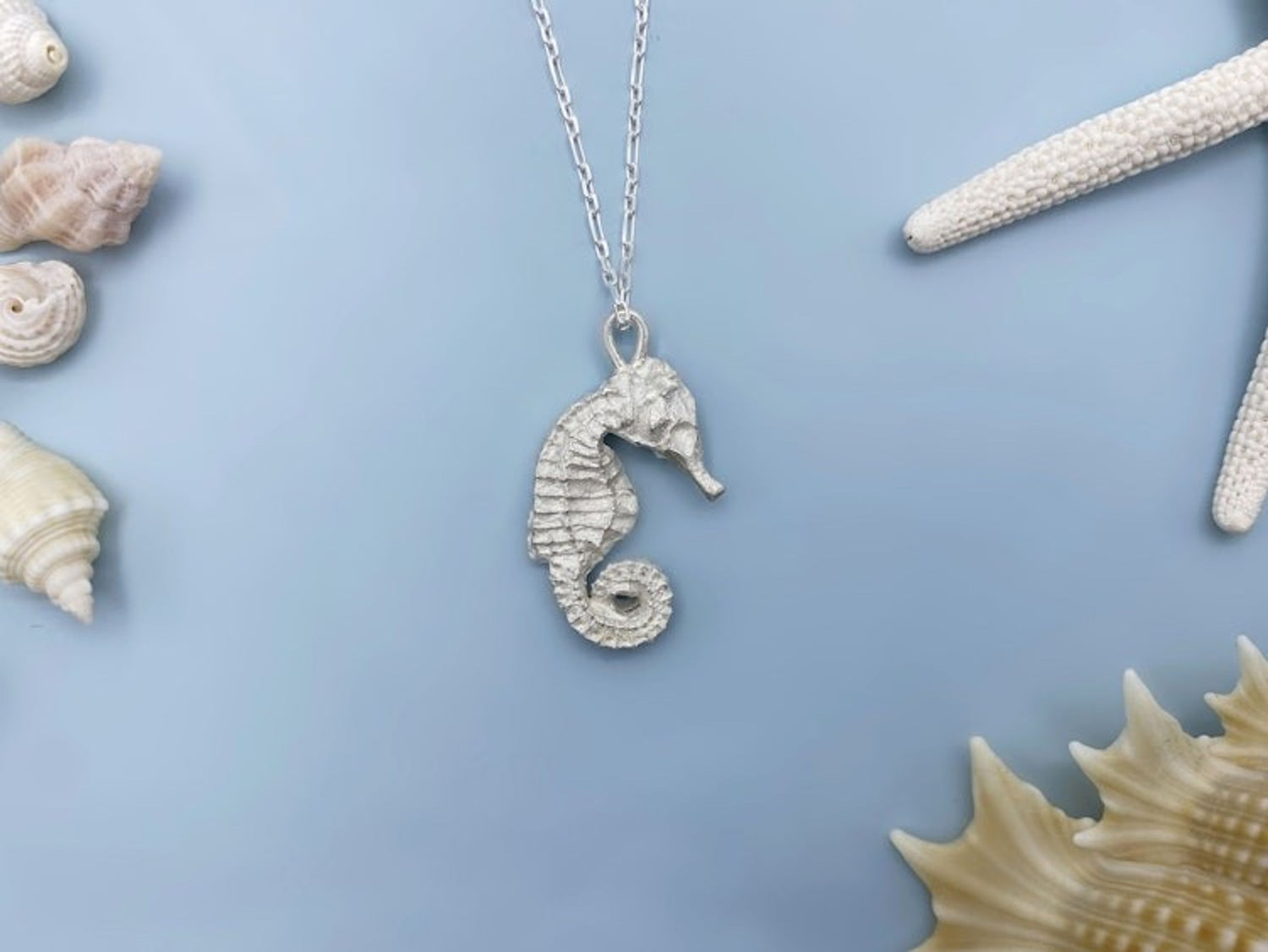 This necklace features a sterling silver seahorse pendant that measures 7/8" (23mm) tall. It is cast from an original sculpture and comes with an 18" sterling silver chain.