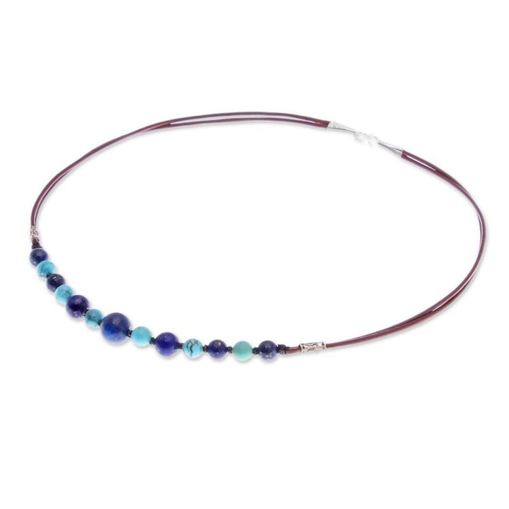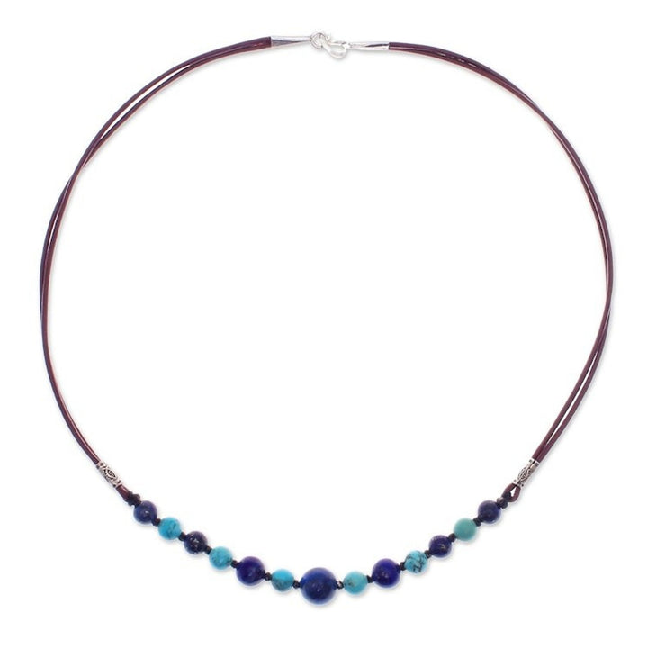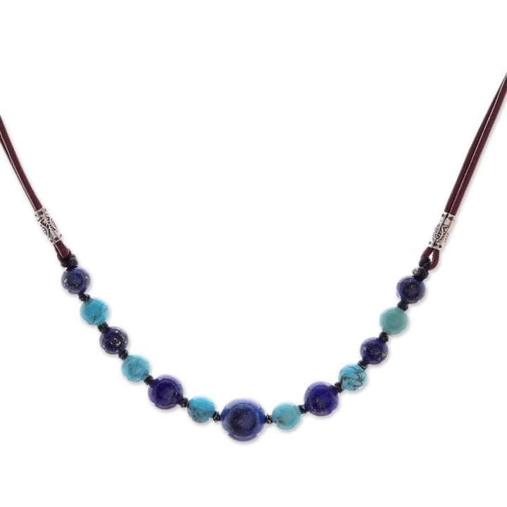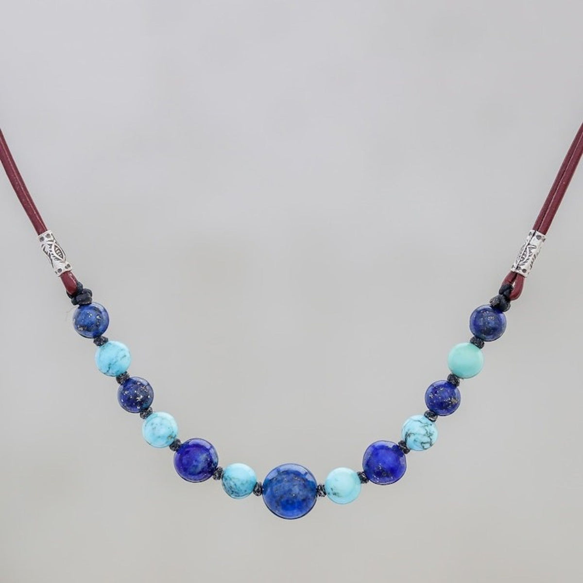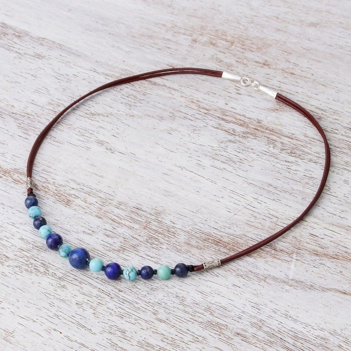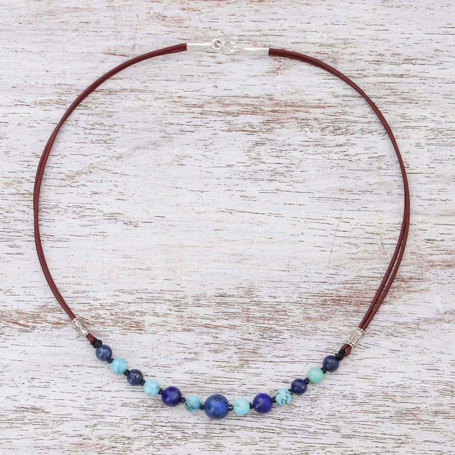Handcrafted in Thailand, this necklace is made from 950 silver, dyed lapis lazuli, dyed howlite, leather cord, and a 925 sterling silver clasp. It weighs 0.35 oz, is 18 inches L, and has a width of 3 mm.