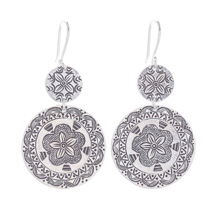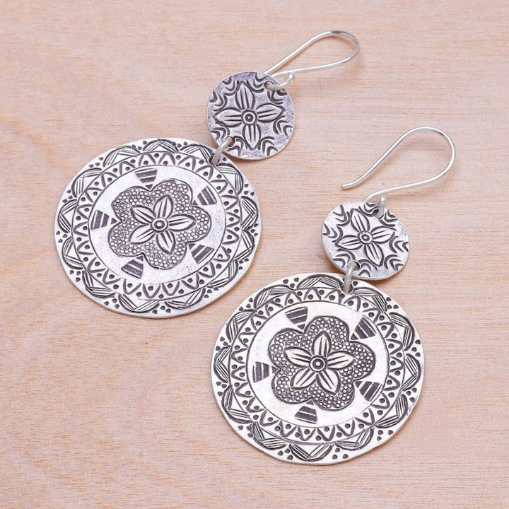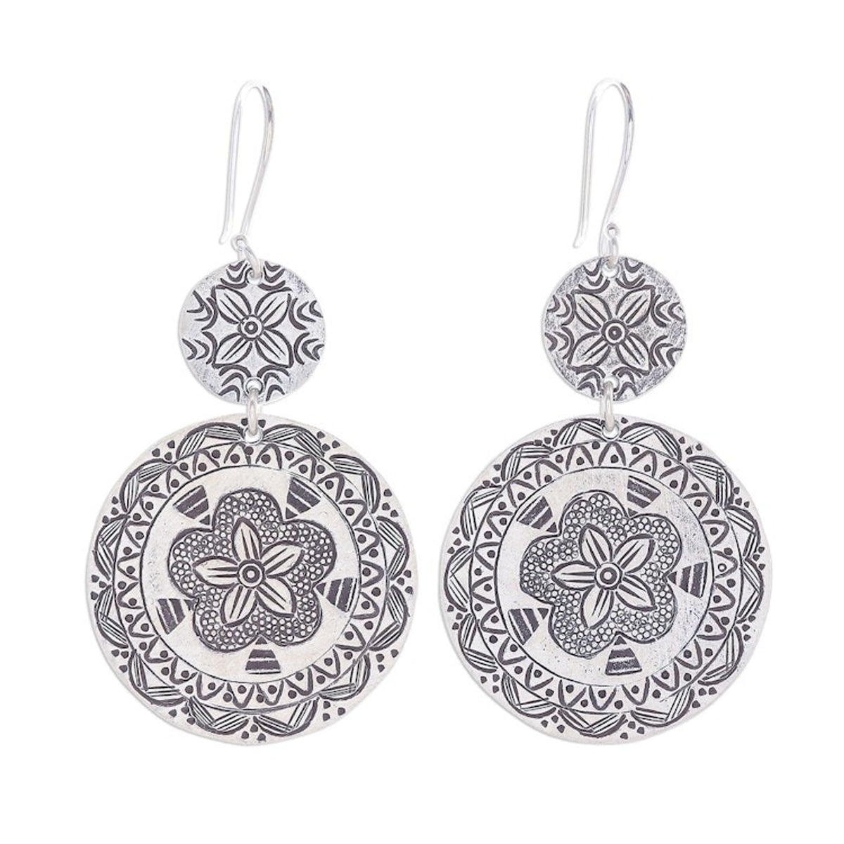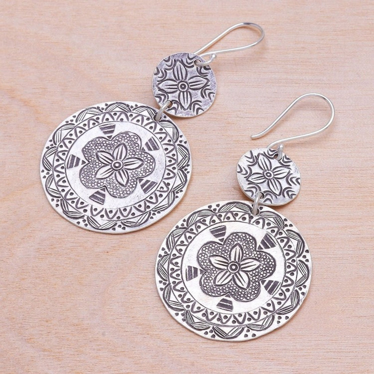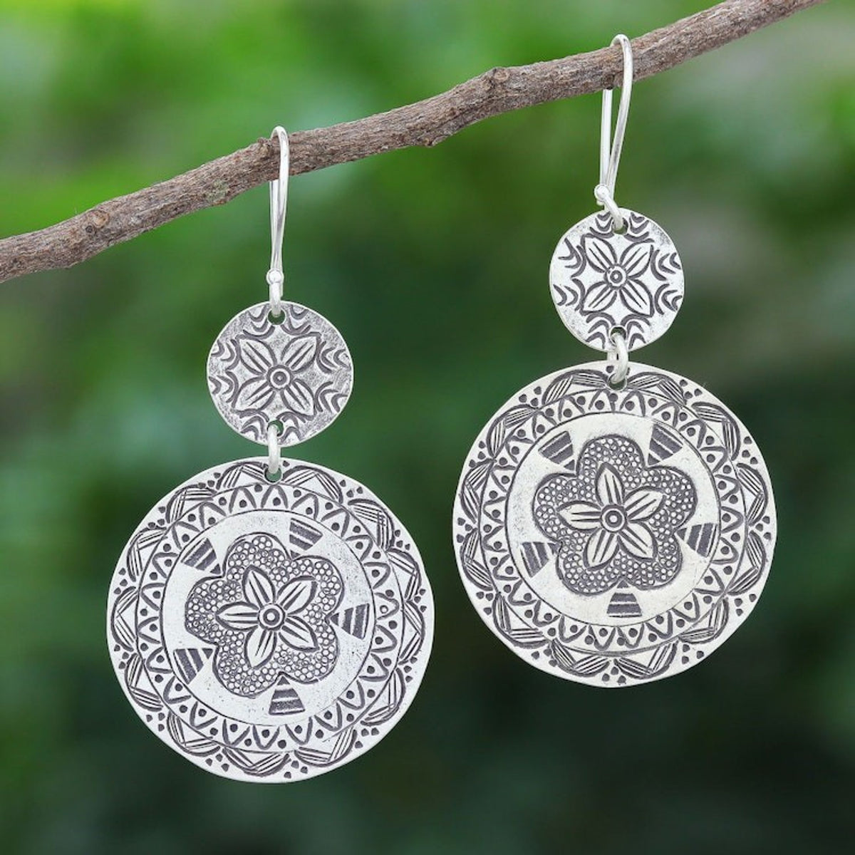 These Handmade Silver Floral Dangle Earrings 'Fancy Flower' by Chanatip Na Lampoon are a charming and delicate expression of floral beauty. Crafted from two shining silver discs, these dangle earrings feature a whimsical floral pattern. A dark oxidized finish enhances the fine details of the blossoms, making them pop with a subtle contrast. This blend of traditional artistry and a modern, polished look makes them an ideal piece for both everyday wear and special occasions. Hanging from sterling silver hooks, they are a beautiful example of Chanatip’s ability to create pieces that are both timeless and full of character.