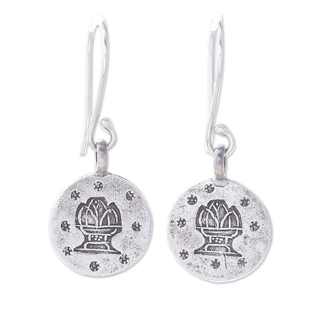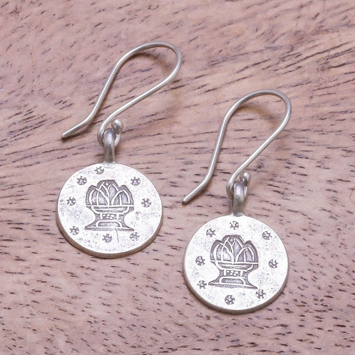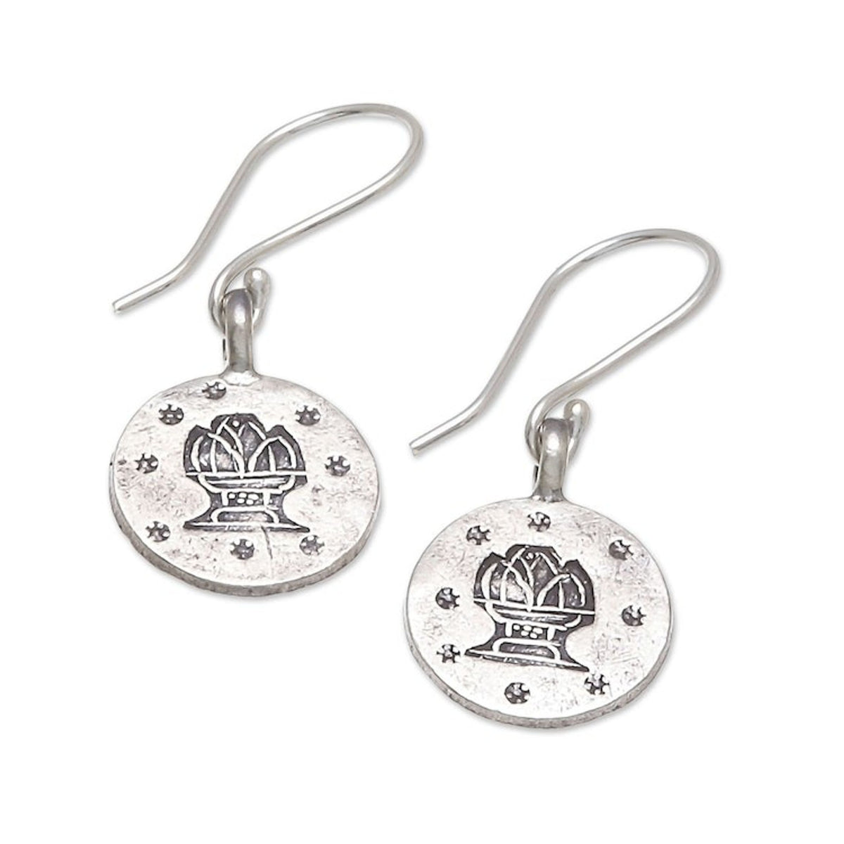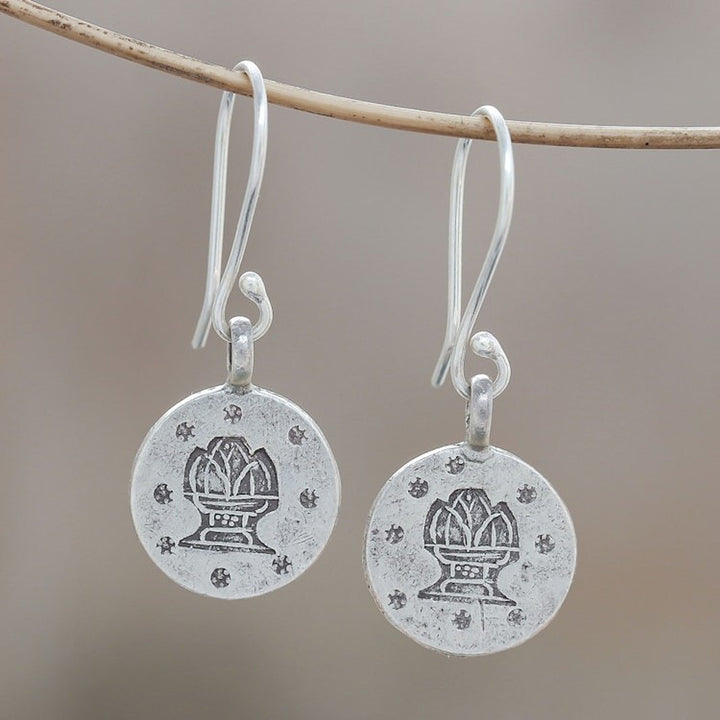 These Karen Silver Aquarius Dangle Earrings from Thailand 'Karen Aquarius' by Chanatip Na Lampoon are a personalized and symbolic accessory for the Aquarius in your life. Each medallion-shaped earring is handcrafted from Karen hill tribe silver, a testament to the artisan's commitment to preserving tribal heritage. The design features a distinct, oxidized stamp of the Aquarius symbol, representing a mythical water bearer and embodying the sign's free-spirited and independent nature. These earrings are a beautiful and meaningful way to celebrate one's zodiac sign, blending ancient artistry with a modern connection to astrology.