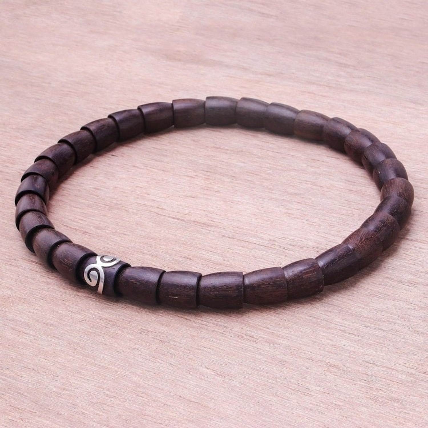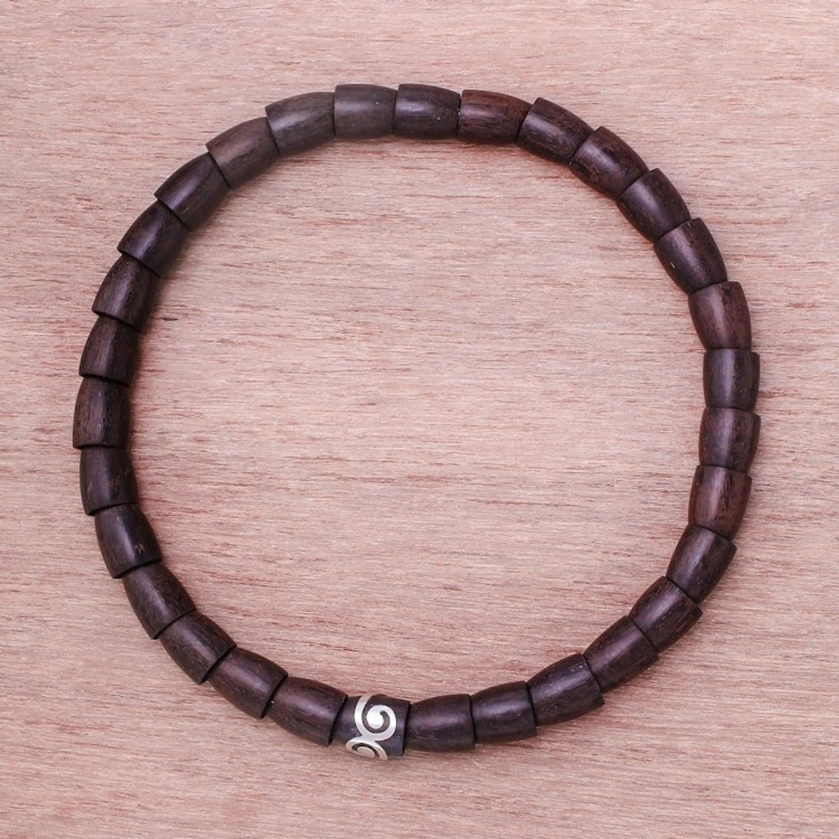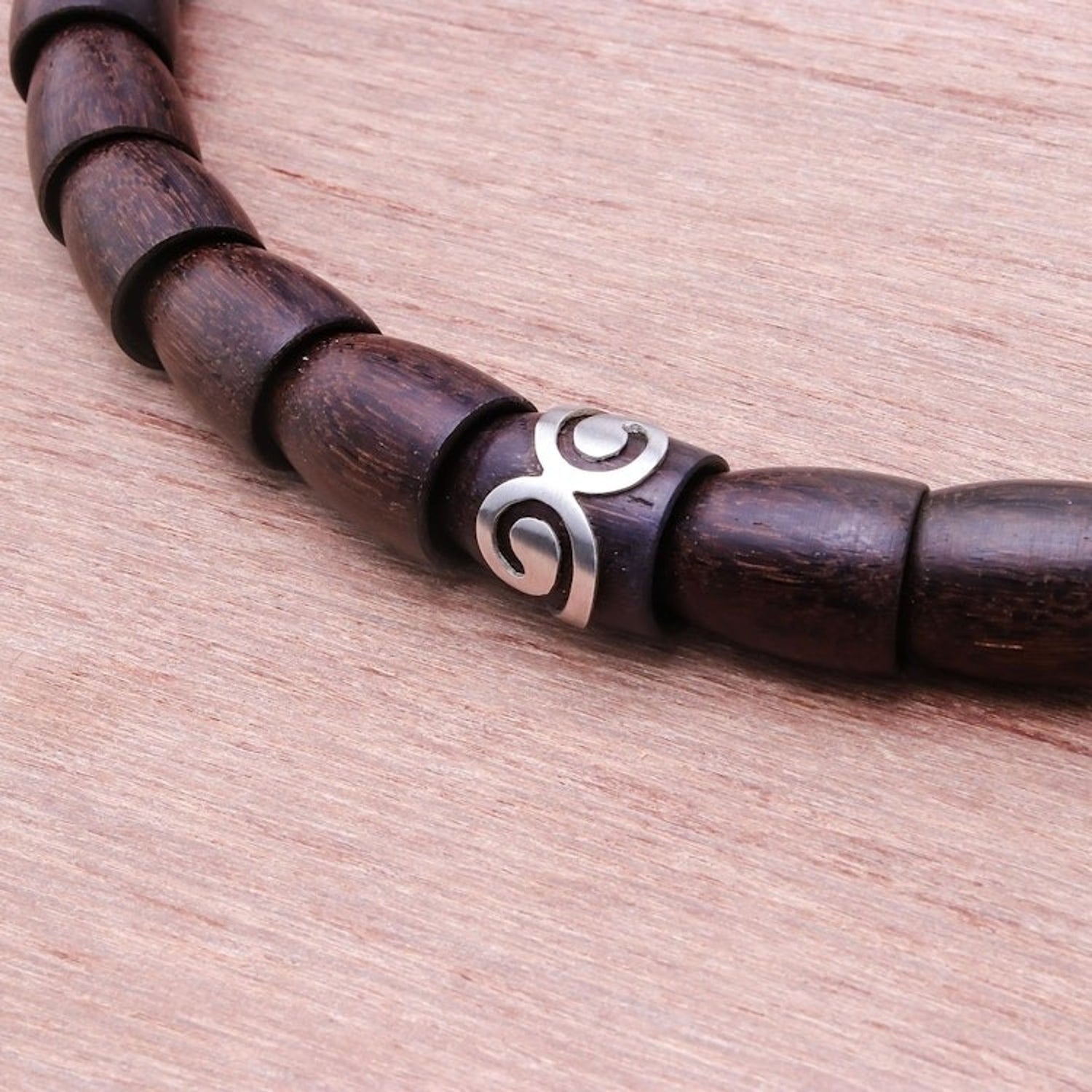 This Dark Wood and Sterling Silver Beaded Stretch Necklace 'Dark Spiral Bangle' by Chiang Mai artisan Ralyon Hengwatanakul is a striking blend of natural materials and contemporary design. Hand-carved from deep brown mai maka wood, each bead forms a lovely stretch necklace. The centerpiece is a stunning sterling silver spiral-patterned bangle that wraps around one of the beads, creating a beautiful contrast and an intriguing focal point. This piece bridges the gap between traditional carpentry and modern silversmithing, appealing to both classic and contemporary tastes. It’s a sophisticated and unique accessory that’s perfect for a man or woman who appreciates fine craftsmanship and a connection to nature.