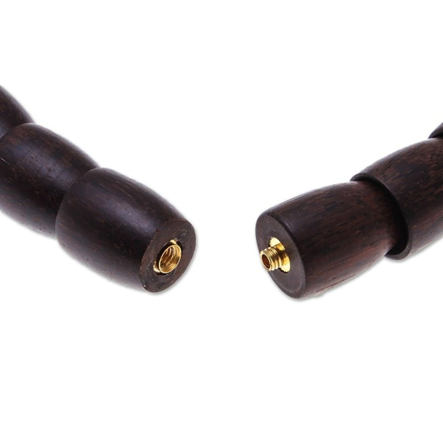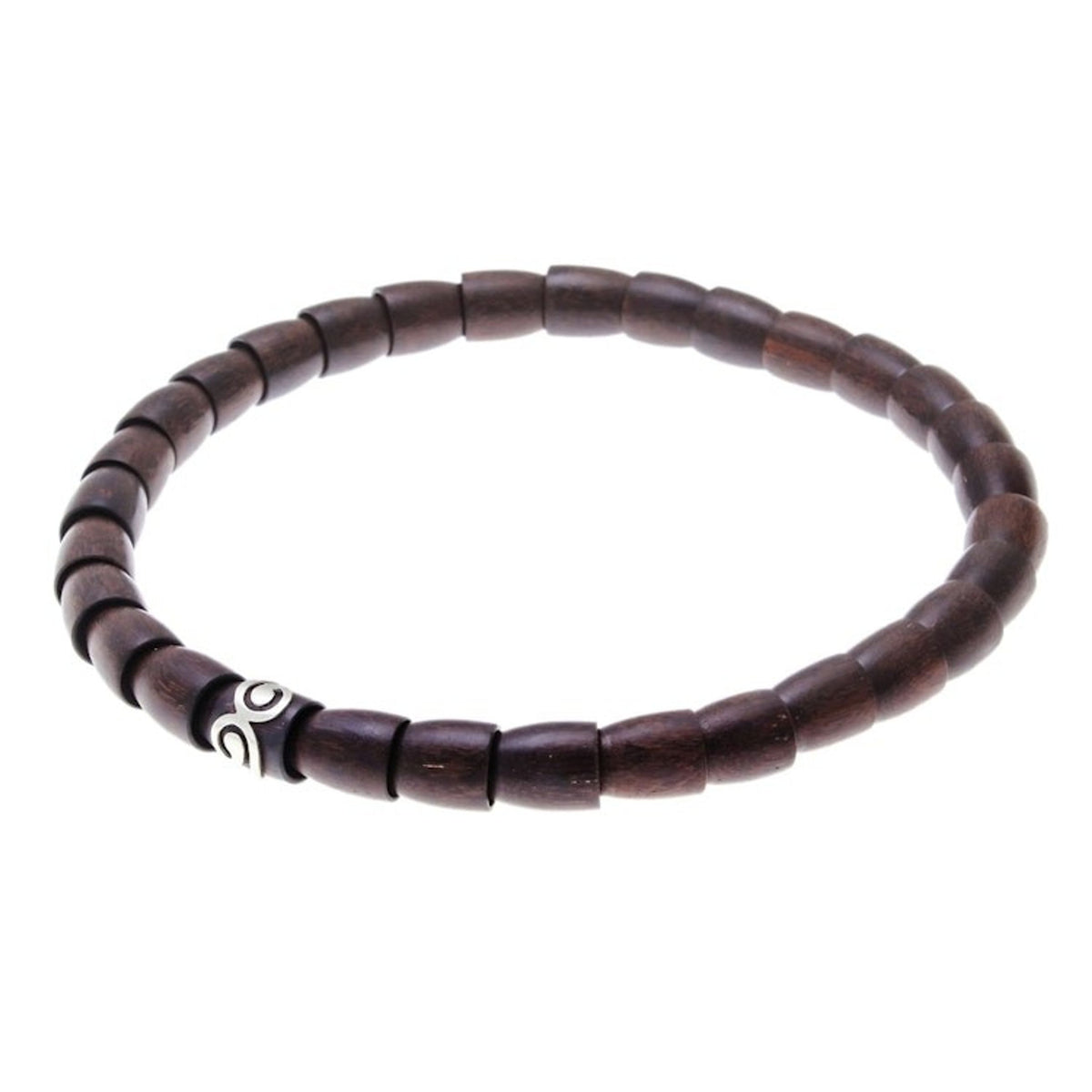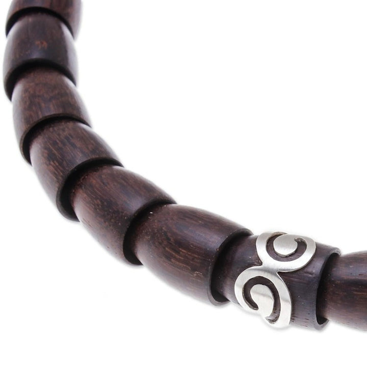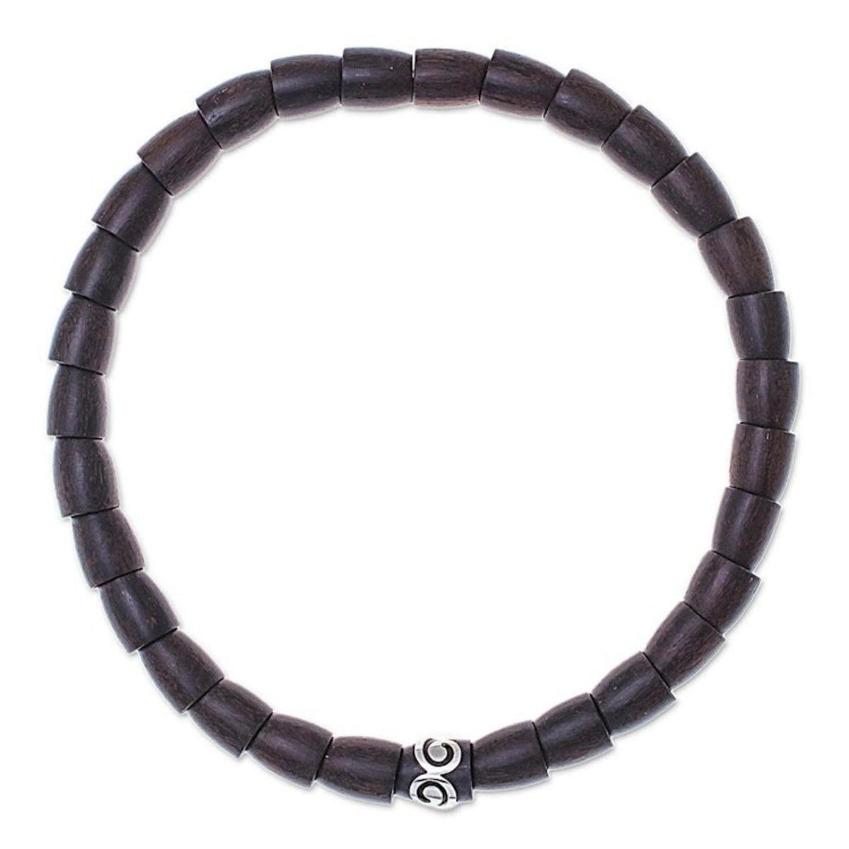 This Dark Wood and Sterling Silver Beaded Stretch Necklace 'Dark Spiral Bangle' by Chiang Mai artisan Ralyon Hengwatanakul is a striking blend of natural materials and contemporary design. Hand-carved from deep brown mai maka wood, each bead forms a lovely stretch necklace. The centerpiece is a stunning sterling silver spiral-patterned bangle that wraps around one of the beads, creating a beautiful contrast and an intriguing focal point. This piece bridges the gap between traditional carpentry and modern silversmithing, appealing to both classic and contemporary tastes. It’s a sophisticated and unique accessory that’s perfect for a man or woman who appreciates fine craftsmanship and a connection to nature.
