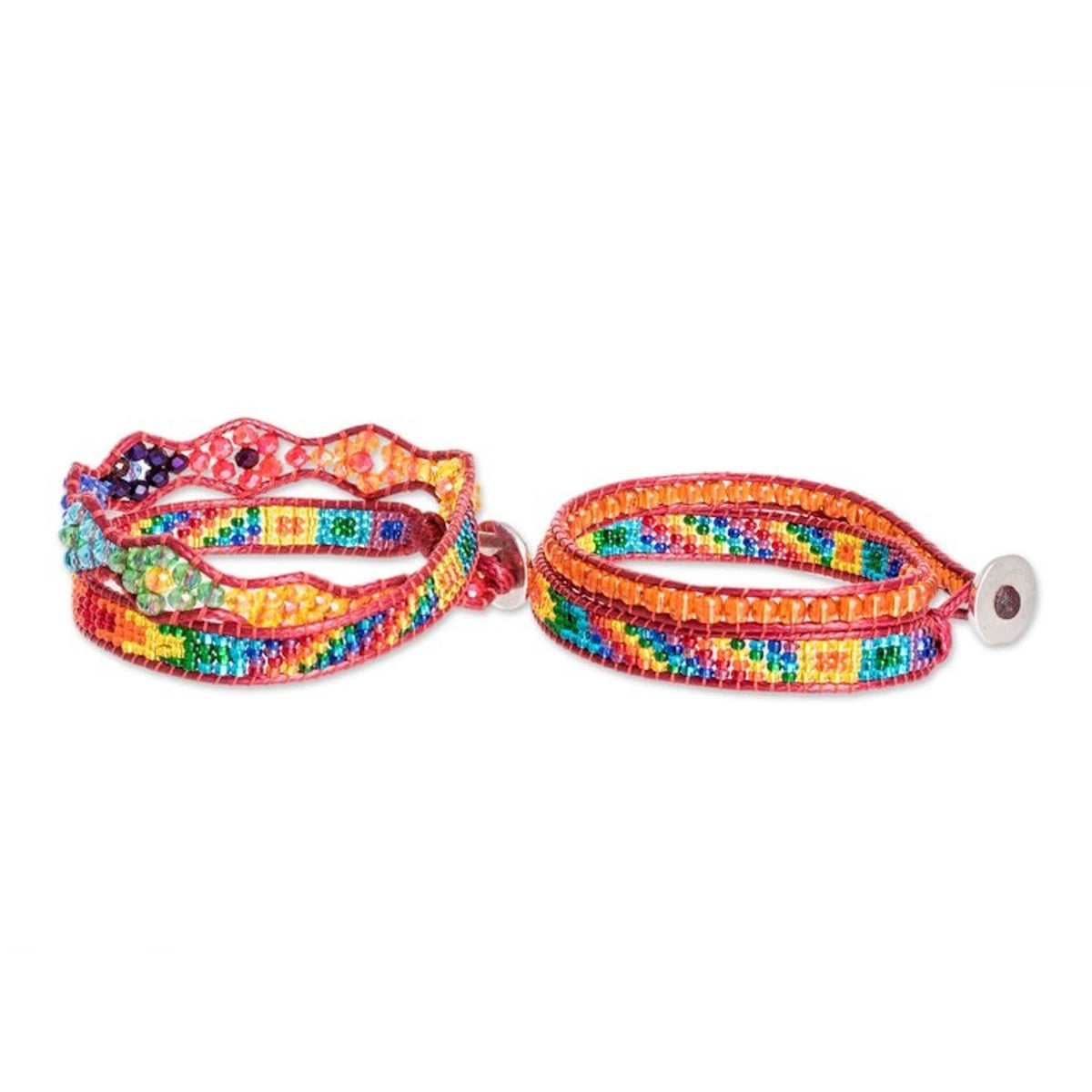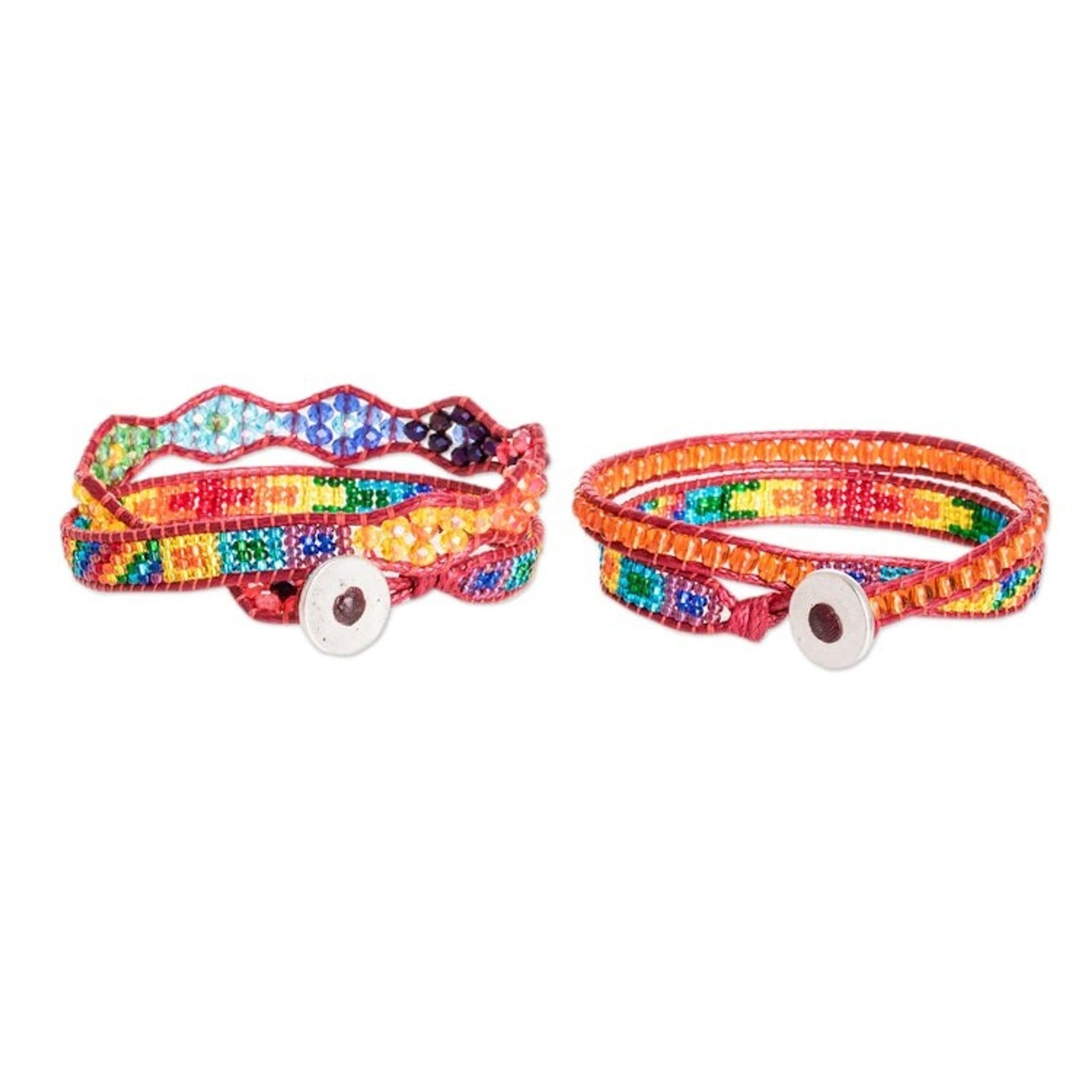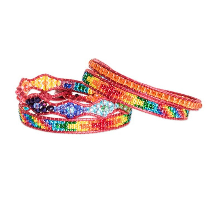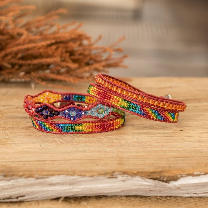 This set of 2 Handmade Colorful Beaded Positive Energy Wrap Bracelets 'Always Connected' by Domingo Reanda is a vibrant and meaningful accessory. Handcrafted on a specialized loom, these wrap bracelets are a burst of lively color, woven with shiny crystal and glass beads. The design is inspired by the rainbow and its significance as a bridge between the earthly and spiritual realms in various cultures. The bracelets are finished with polished Tibetan-style pewter buttons, making them a spirited and harmonious addition to any outfit. This set is a beautiful expression of unity and purpose, crafted with a strong sense of cultural resonance.