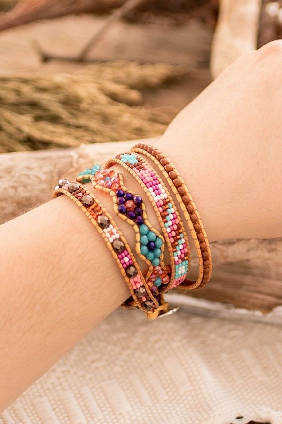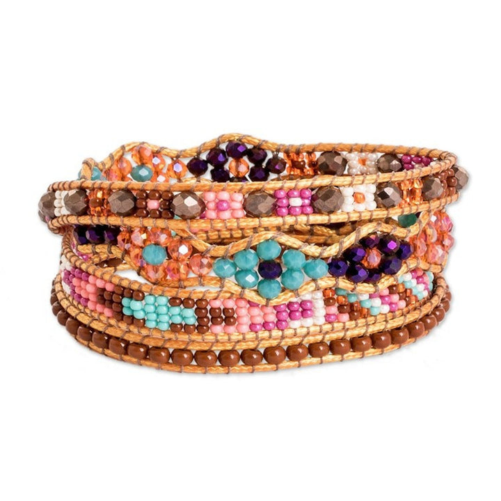This Handwoven Beaded Brown Wrap Bracelet with Pewter Button 'Market Life' by Domingo Reanda is a bold and versatile accessory. The design is inspired by the lively markets of Santiago Atitlán, Guatemala, and features sparkling crystal and glass beads woven on durable nylon cords. The beads depict elements of market life, such as cobblestone streets, vibrant textiles, and blooming flowers, creating a symbolic and captivating piece. A pewter button closure adds a polished finish, making this bracelet a beautiful statement piece that reflects the vibrant culture of Guatemala.