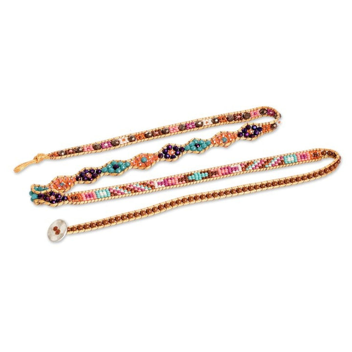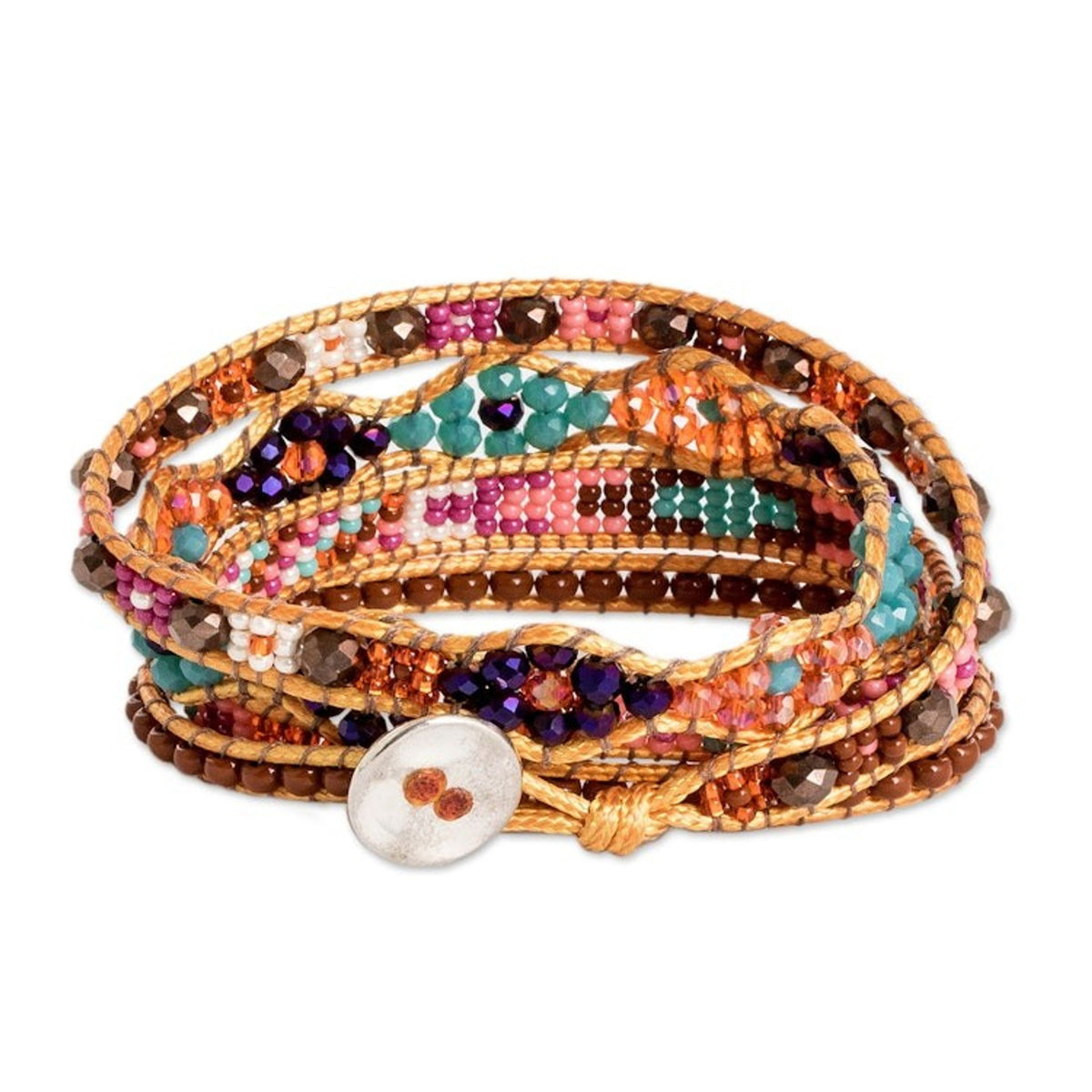 Handcrafted in Guatemala from crystal and glass beads, nylon cord, and a pewter button, this wrap bracelet measures 31 inches long by 0.5 inches wide and features a high polish finish and a button clasp.