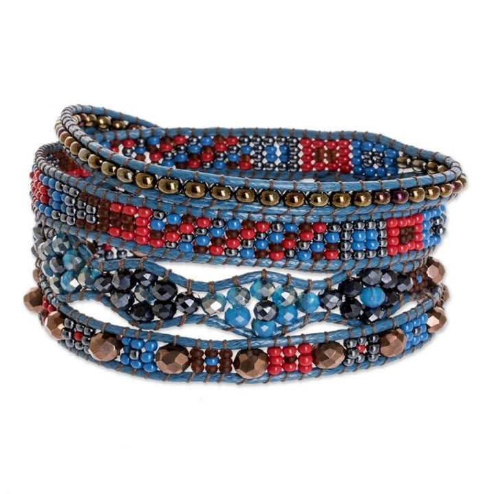 This Handcrafted Beaded Positive Energy Long Wrap Bracelet 'Secure Serenity' by Domingo Reanda is a colorful and serene accessory. Hand-knotted with crystal and glass beads on nylon cords, the bracelet is inspired by the hues of blue, red, and earthy tones to evoke a profound sense of security. The colors symbolize love, the fluidity of life, and the unwavering certainty of one's place in the world. This bracelet is designed to serve as a steadfast reminder to maintain a positive outlook and find inner peace, with a pewter button serving as the clasp.