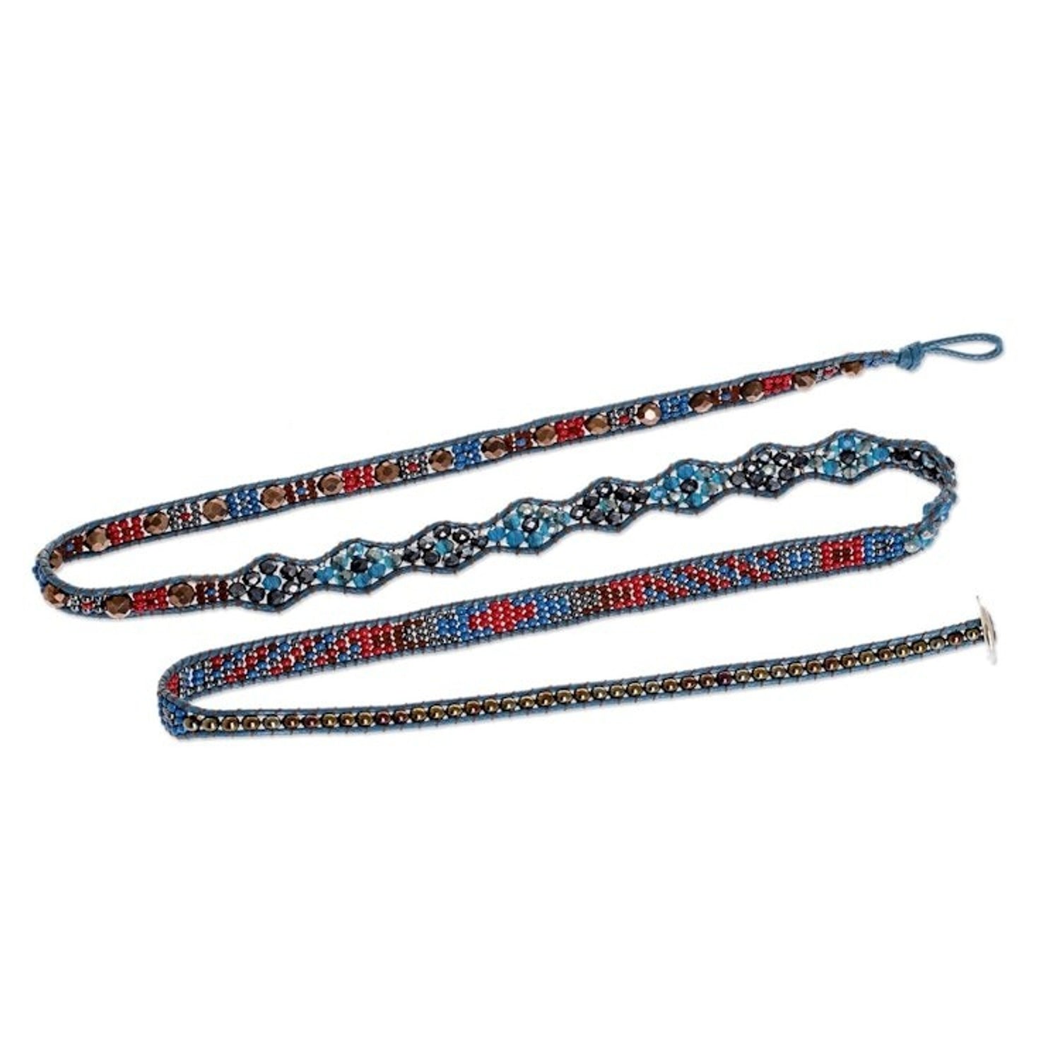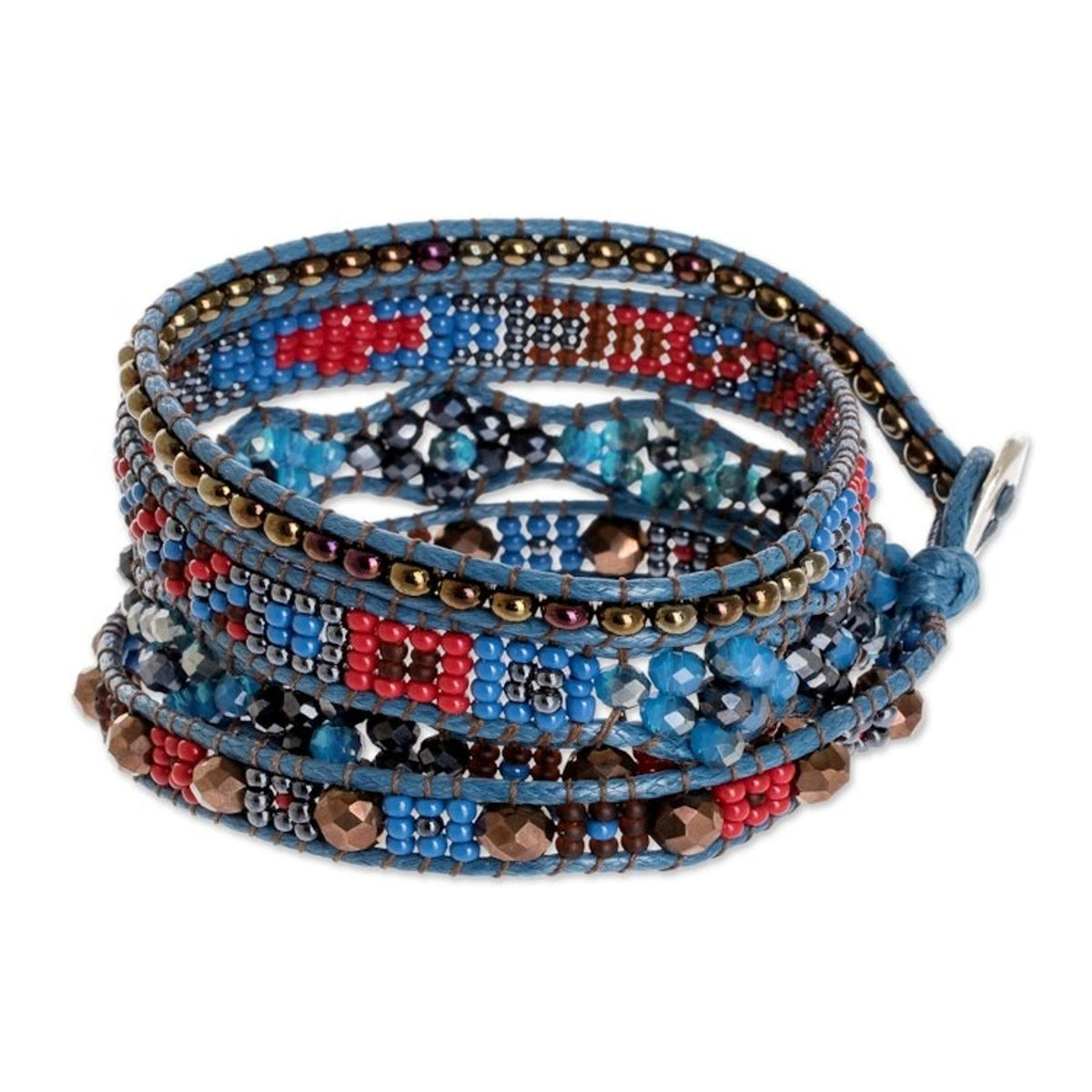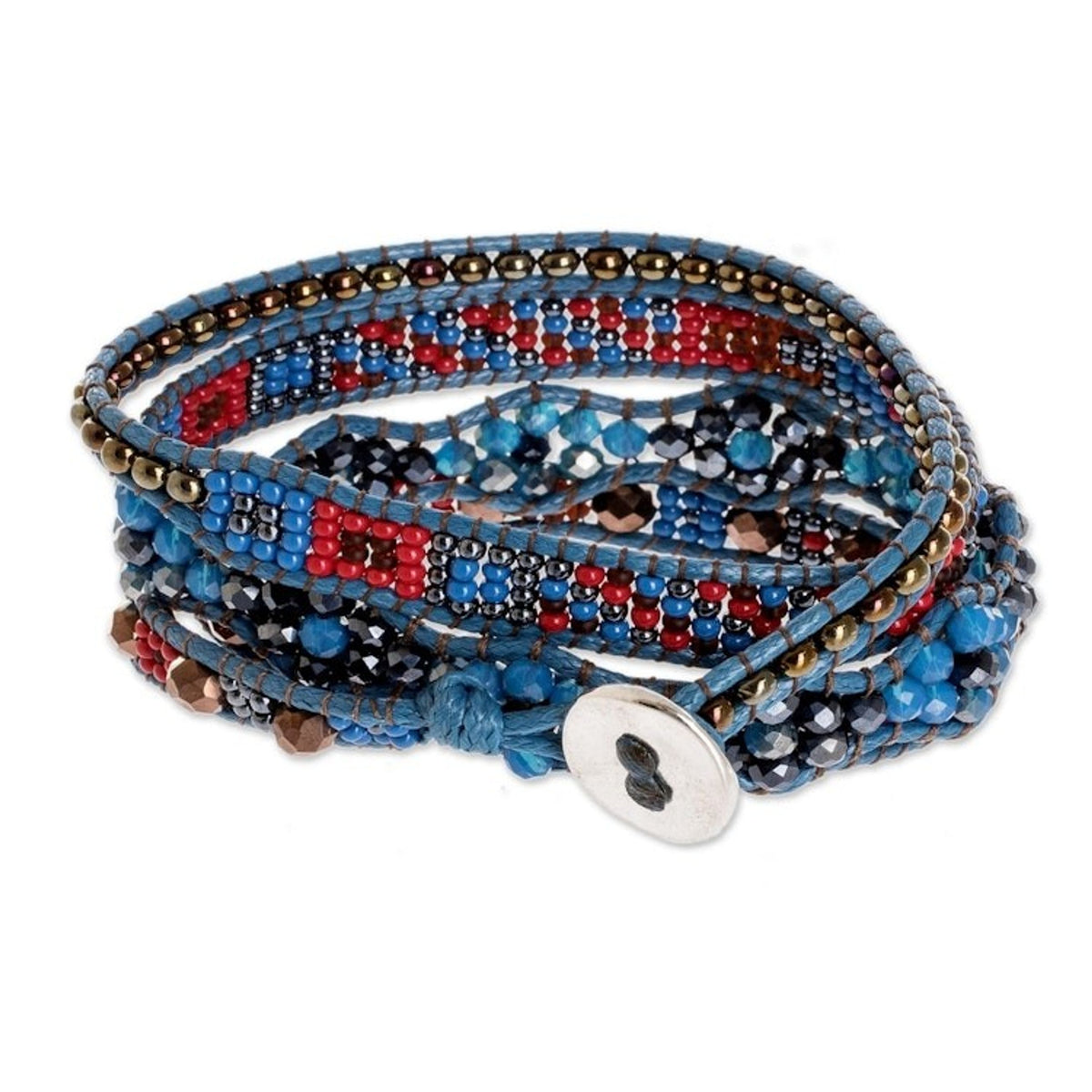 Handcrafted in Guatemala from nylon cord, glass and crystal beads, and a pewter button, this wrap bracelet measures 31 inches long by 0.5 inches wide and features a button clasp.