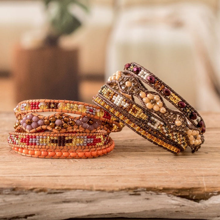 Handcrafted in Guatemala from glass and crystal beads, nylon cord, and a pewter button closure, each bracelet measures 31 inches long by 0.5 inches wide and features a high polish finish and a button clasp.