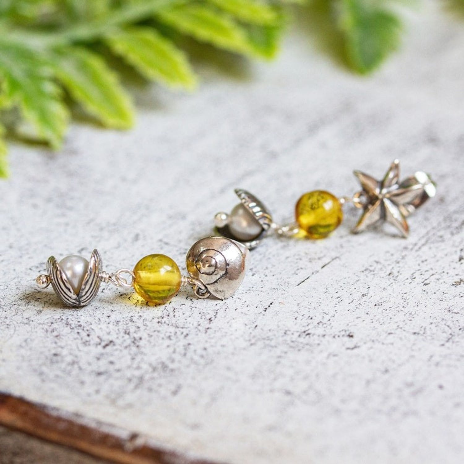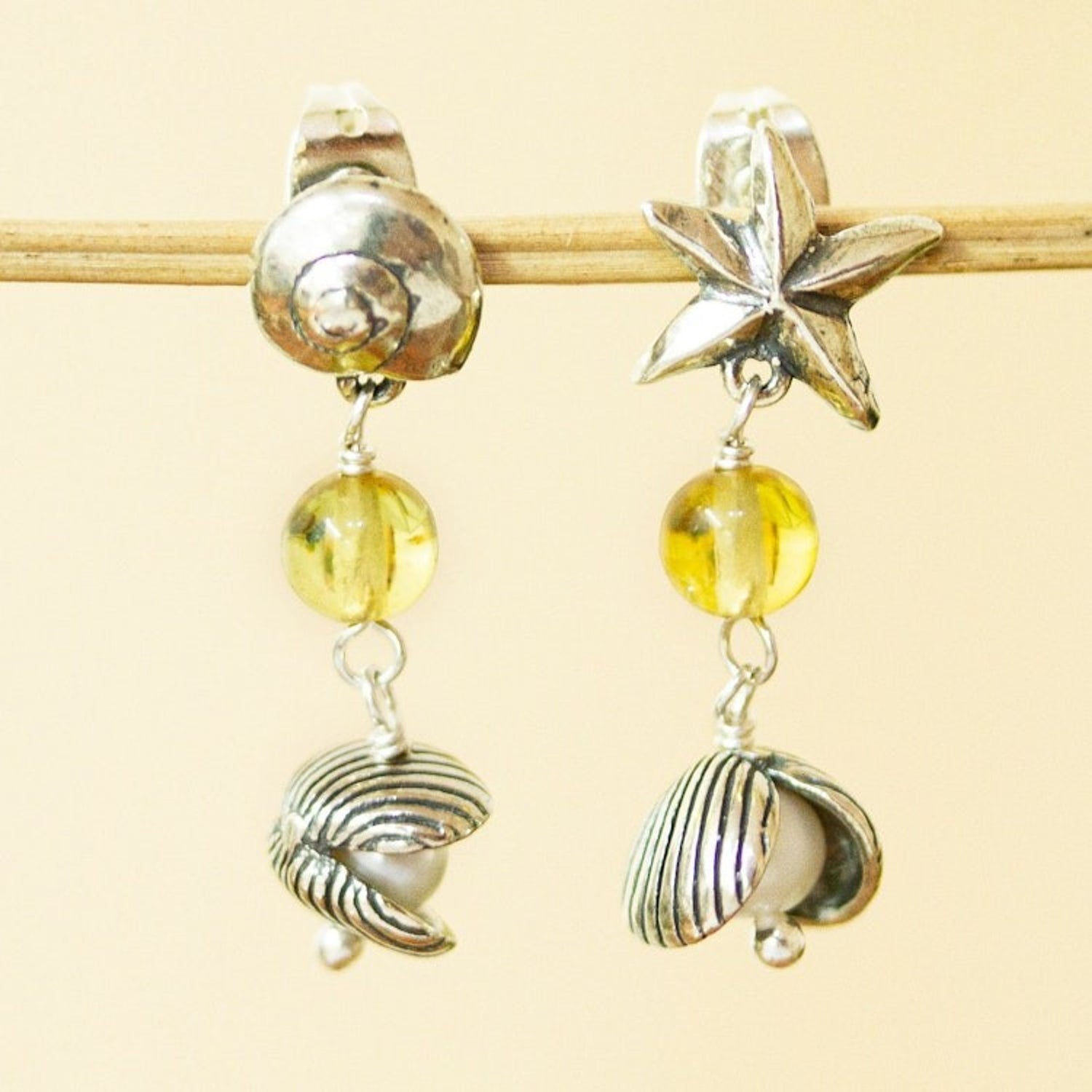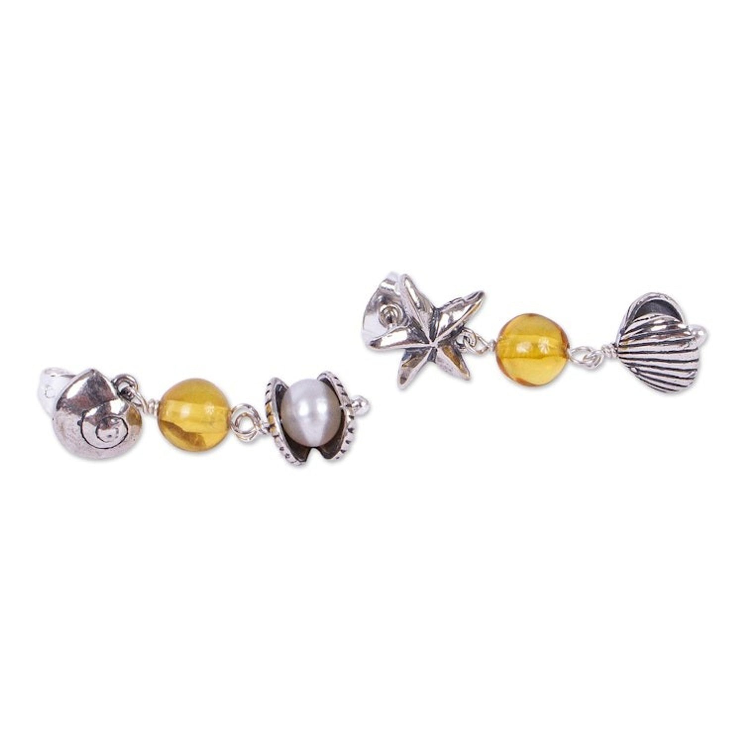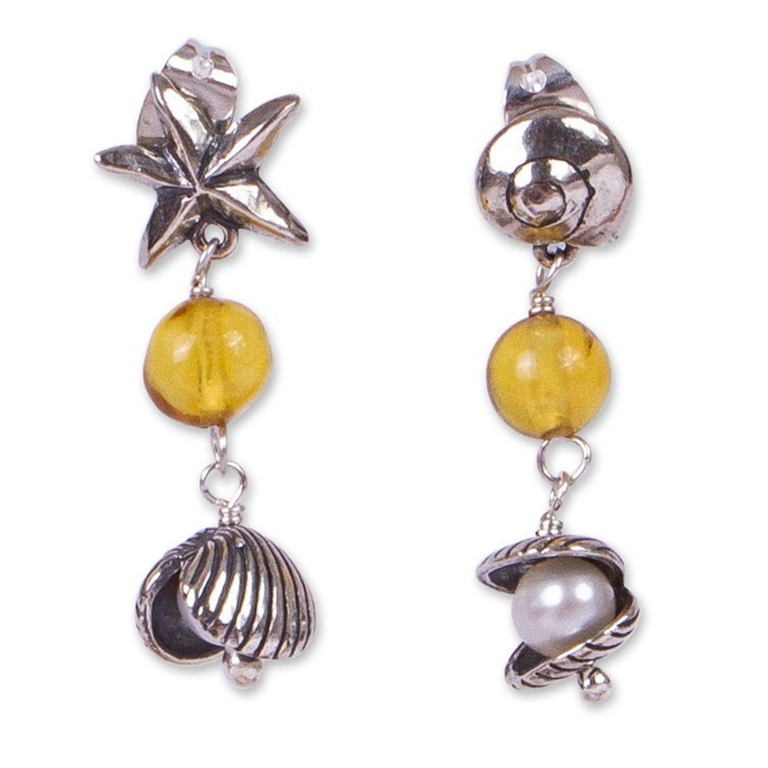 These Ocean-Themed Amber Dangle Earrings from Mexico 'Amber Sea' by Flora Mar are a fun and lovely accessory. The dangle earrings feature sea shells and a starfish crafted from sterling silver, which are accentuated by small beads of natural amber and cultured freshwater pearls. The design depicts the "beauty of the ocean" and adds a hint of fun to any outfit. This piece is a beautiful example of the artist's ability to bring her distinctive collections to life.