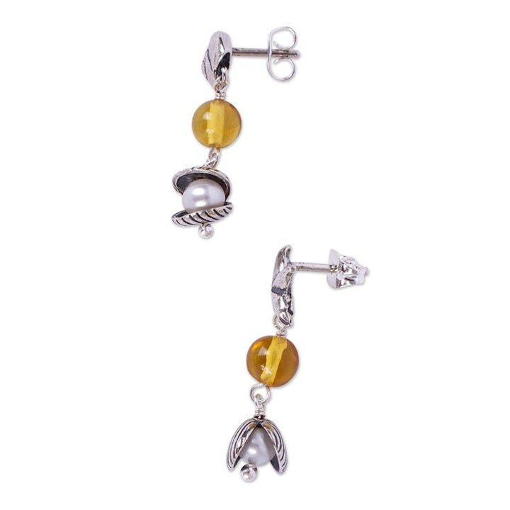 Handcrafted in Mexico from 925 sterling silver, cultured freshwater pearl, and amber, each earring measures 0.8 inches long and features a combination finish and post earring style.