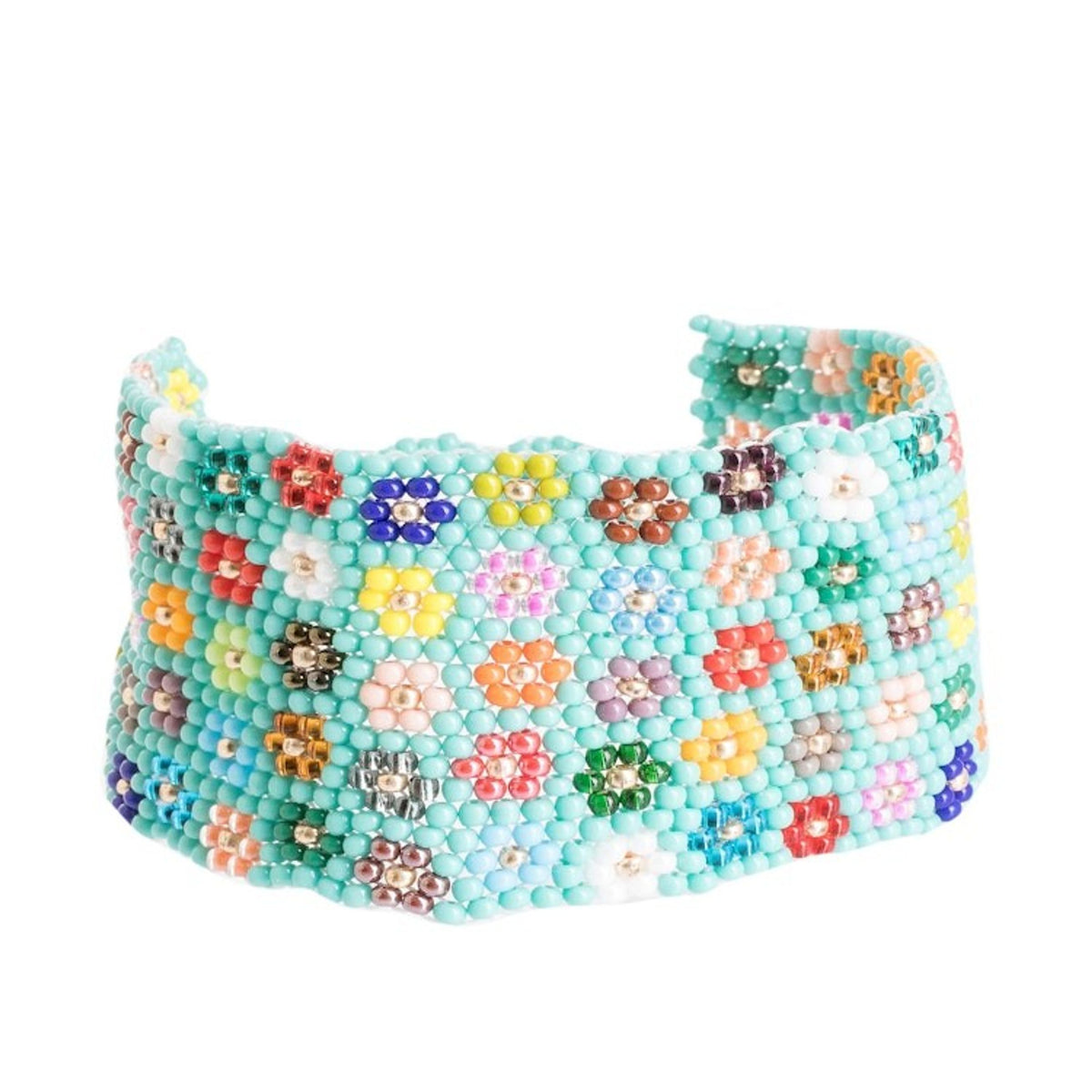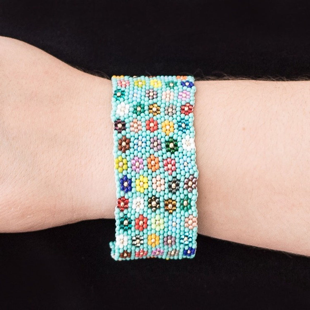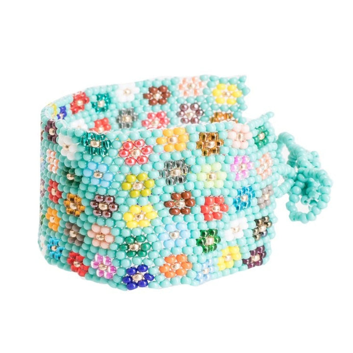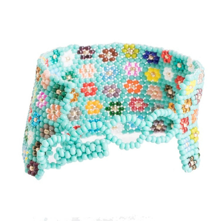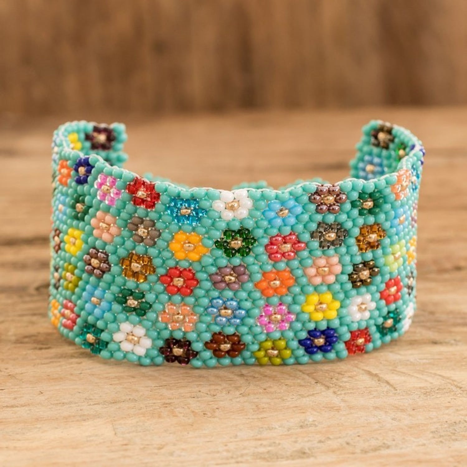 This 'Cool Blossoming Harmony' wristband bracelet by Mirian Zet is a celebration of the sweet, natural beauty found in her Guatemalan homeland. Mirian, an artisan devoted to preserving her family's traditional beadwork, infuses this piece with a refreshing aura and a joyful, imaginative spirit. The bracelet features a myriad of colorful flowers meticulously handcrafted from glass beads on a trendy green base. It’s not merely an adornment but a wearable piece of heritage and hope, reflecting the love and determination Mirian pours into her craft to support her community. The toggle clasp ensures comfortable and secure wear.