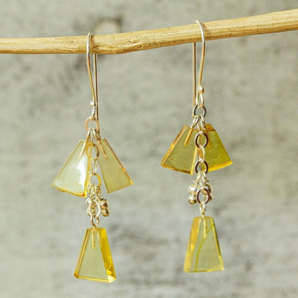 These 'Golden Legends' dangle earrings by Jacqueline and Eddy are a stunning tribute to the ancient art of working with amber in Simojovel, Mexico. This elegant pair features a cascade of hand-carved, triangular pendants of natural amber, a material revered for its mystical and medicinal qualities. Each amber piece is unique, with its own rich tones and potential for fossilized inclusions, serving as a testament to its organic origin and authenticity. The sterling silver setting complements the warm golden glimmer of the amber, creating a piece that honors Chiapas’ cultural identity. These earrings are a captivating blend of heritage and subtle sophistication, designed to add a touch of timeless magic to any look.
