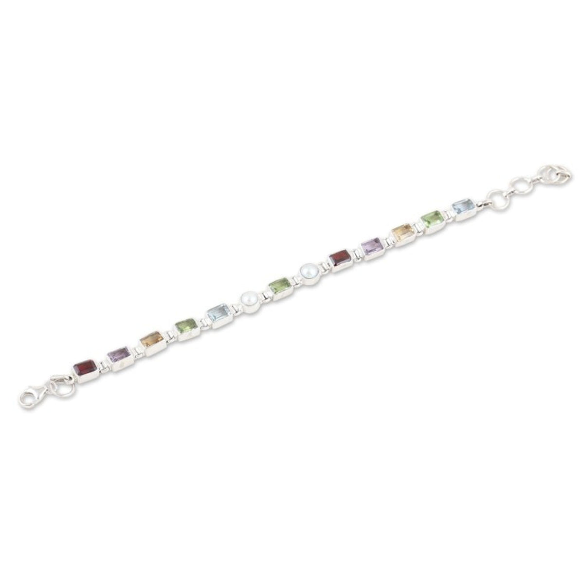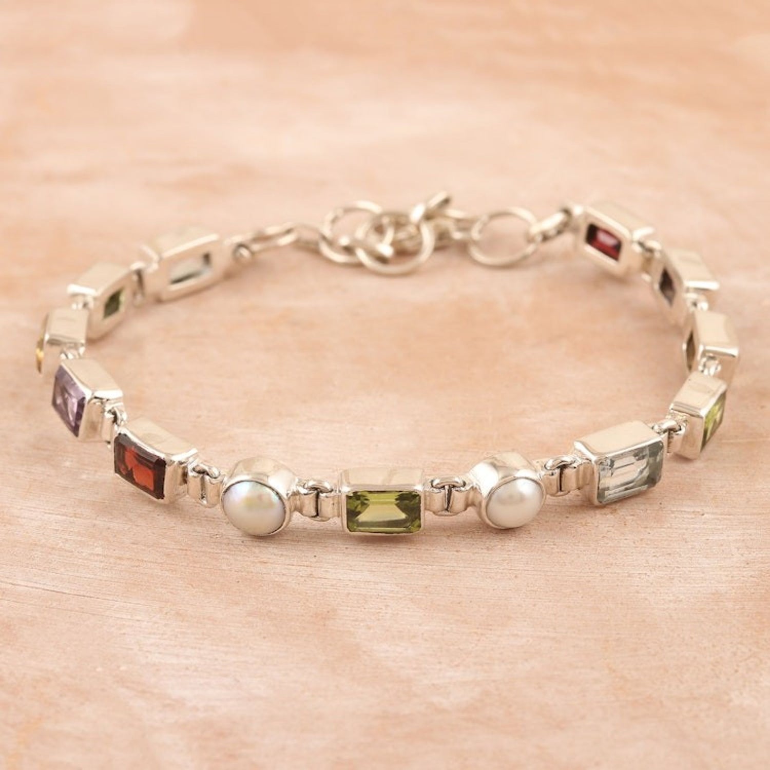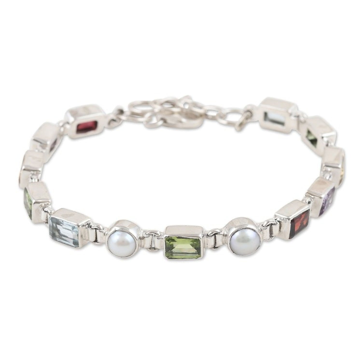 Handcrafted in India from 925 sterling silver, with peridot, amethyst, garnet, citrine, blue topaz, and cultured pearls. The adjustable bracelet measures between 7.3 and 8.5 inches in length and features a lobster claw clasp.