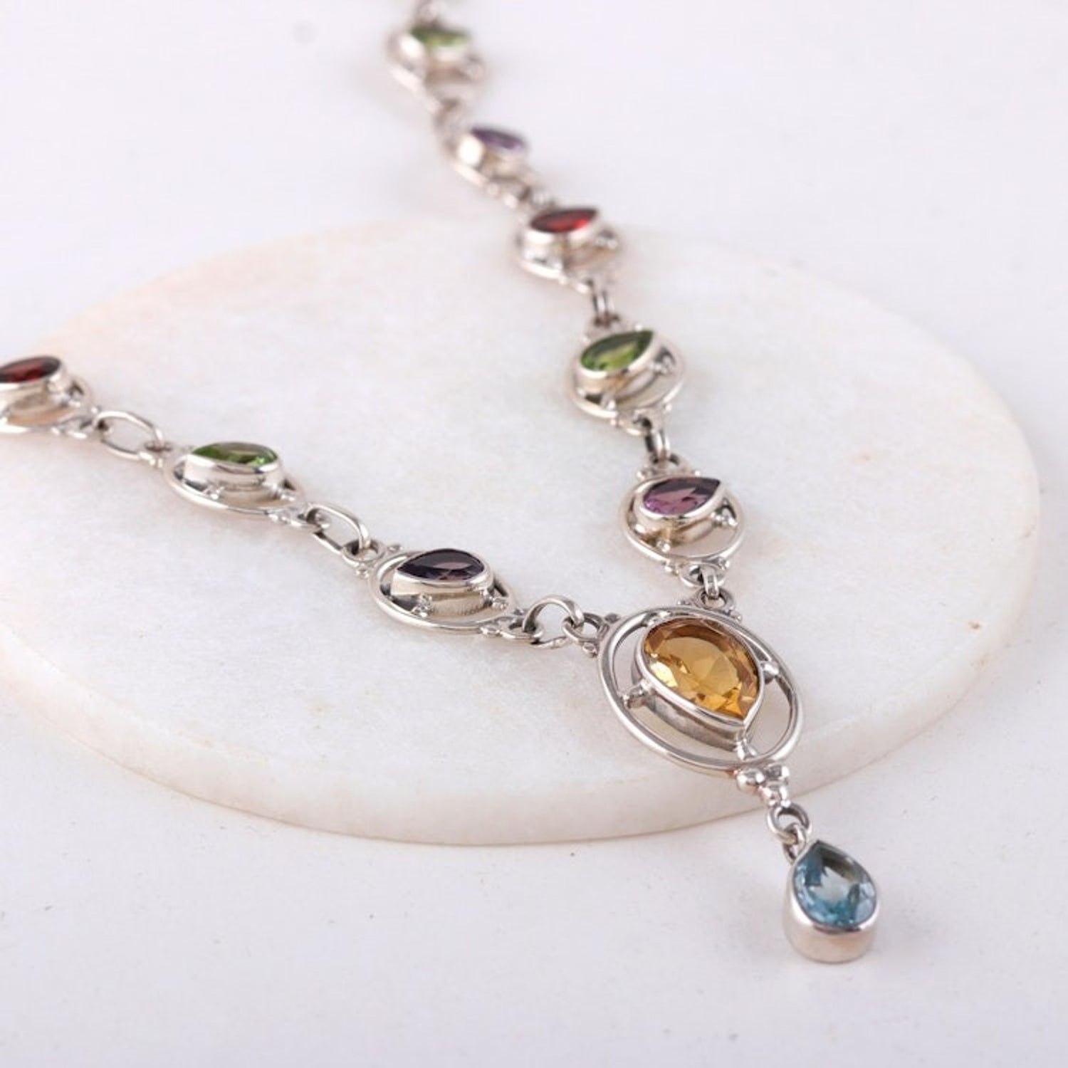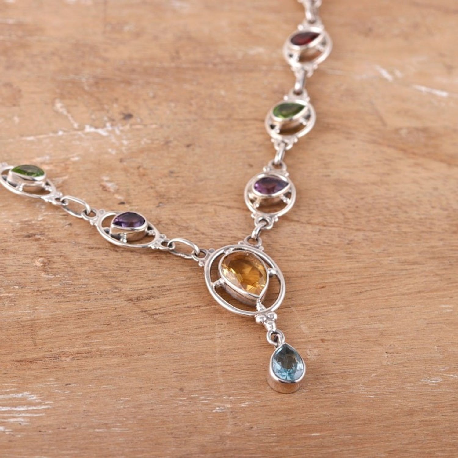 This 'Vibrant Magic' Y necklace by Neeru Goel is a glorious piece that captures the essence of the birthstones and the rich artistry of India. Crafted from sterling silver, this elegant Y necklace features a gorgeous polished finish that enriches its refined formations. The centerpiece is a stunning combination of pear-shaped garnet, peridot, amethyst, citrine, and blue topaz jewels, totaling twelve carats. This necklace is more than just adornment; it's a celebration of India’s cultural heritage and the magical qualities of gemstones, a perfect accessory for those who appreciate glamour and mysticism.
