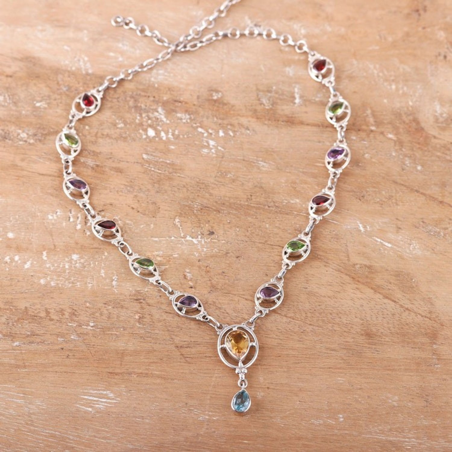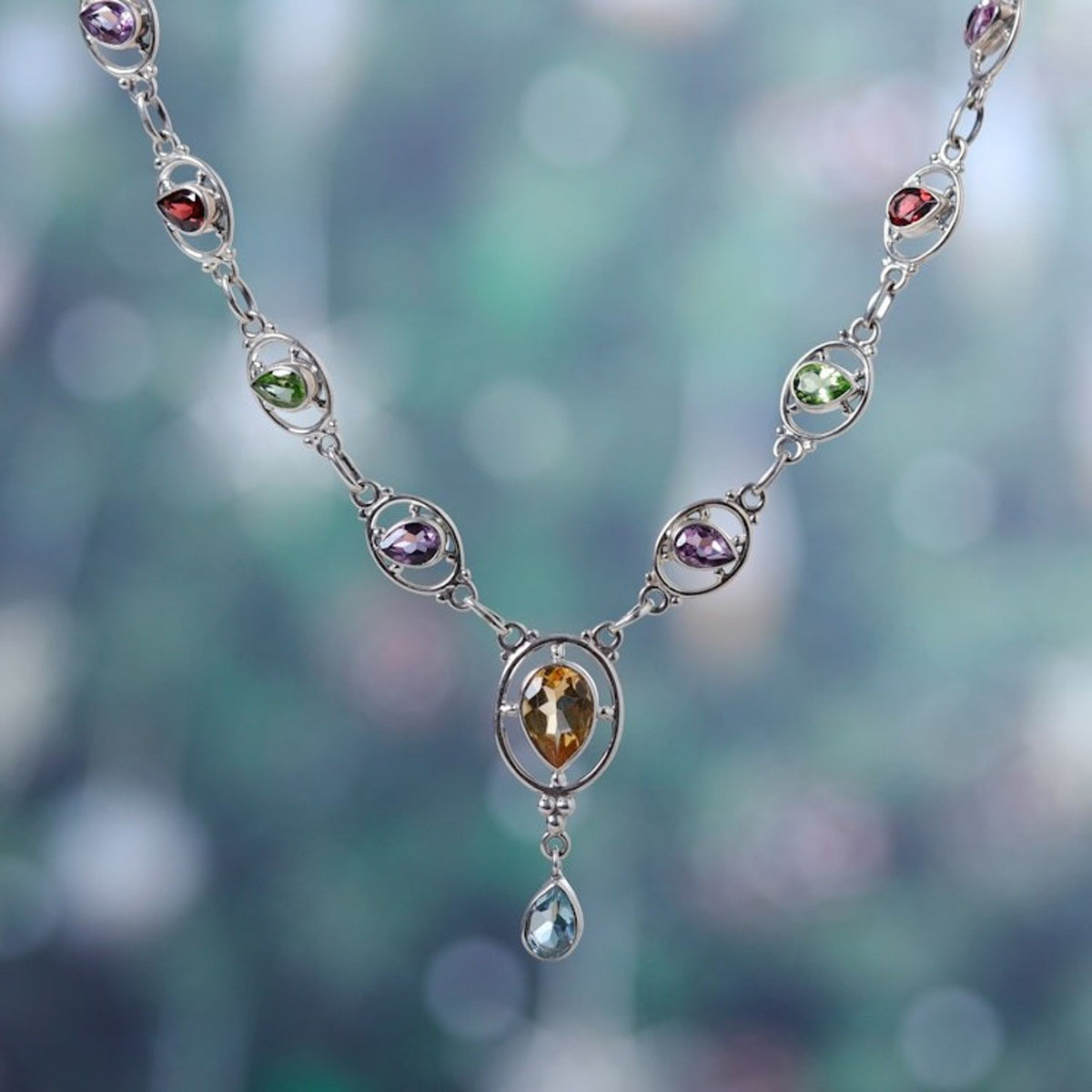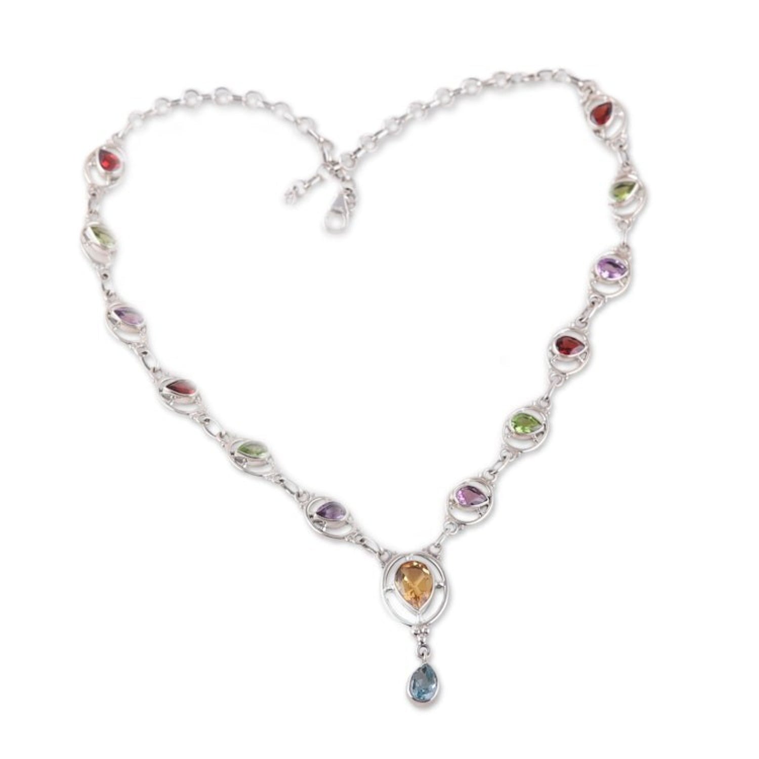 Handcrafted in India from 925 sterling silver, garnet, peridot, amethyst, citrine, and blue topaz, with a combination finish. The adjustable necklace measures between 17.8 and 18.5 inches in length, and the pendant is 1.4 inches in length by 1 inch in width. It features a lobster claw clasp.
