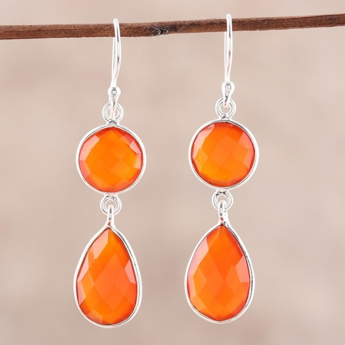 These 'Fiery Charm' dangle earrings by Alok Jain are a captivating celebration of the natural world and timeless elegance. The design features a fiery pair of faceted carnelian gemstones, with two circles and two teardrops, totaling an impressive 13.5 carats. Each stone is set in high-polish sterling silver, creating a brilliant contrast that enhances the carnelian’s warm, vibrant hue. The craftsmanship reflects the artist’s dedication to precision and uncompromising quality, transforming a simple accessory into a work of art. These earrings are a powerful statement piece, perfect for adding a touch of bold, fiery charm to any ensemble.