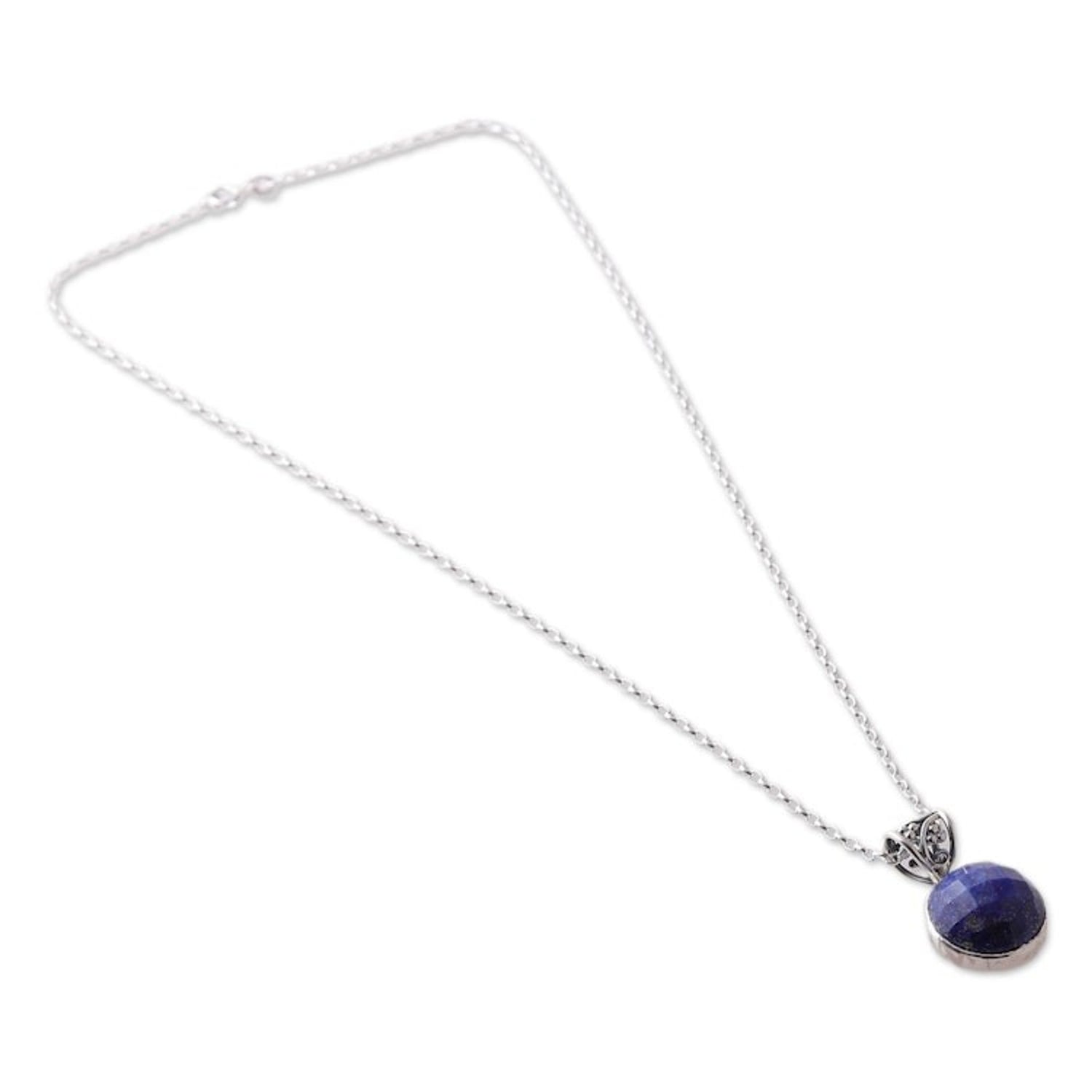 Handcrafted in India from 925 sterling silver and lapis lazuli, with a combination finish. The necklace measures 18 inches in length, and the pendant is 1.1 inches in length by 0.6 inches in width. It features a spring ring clasp.