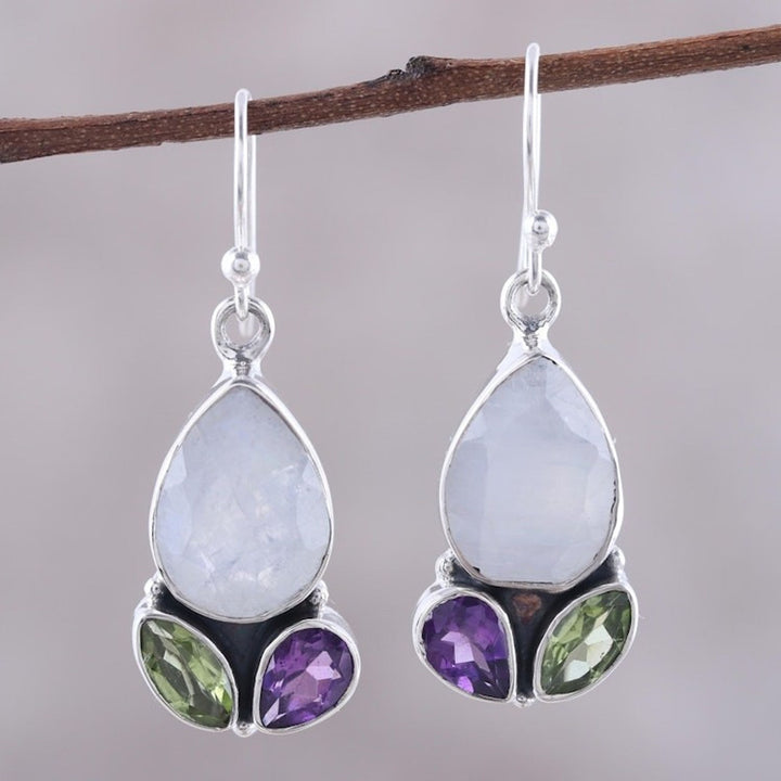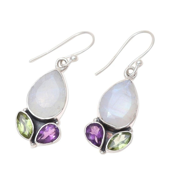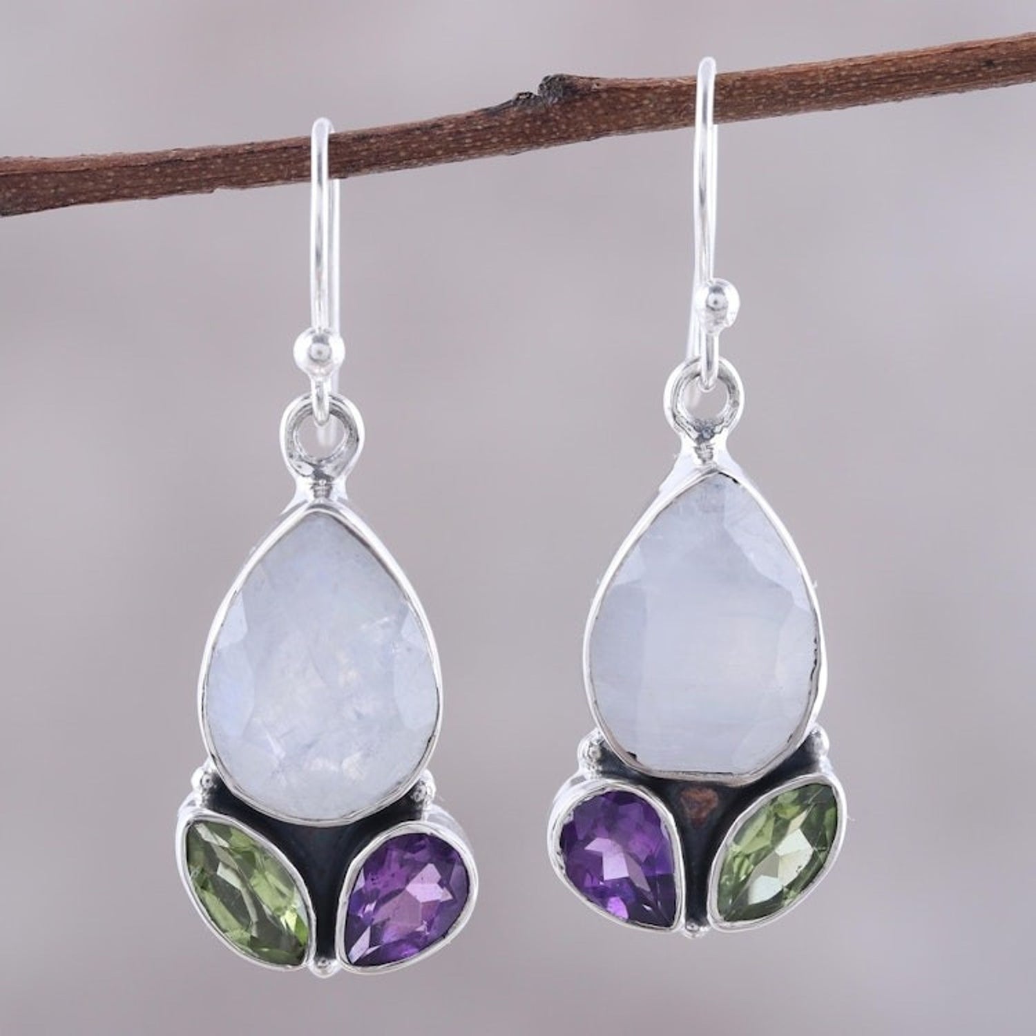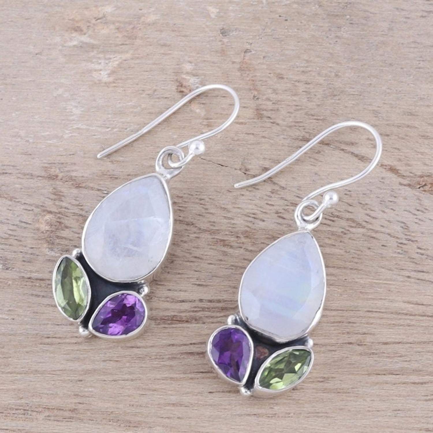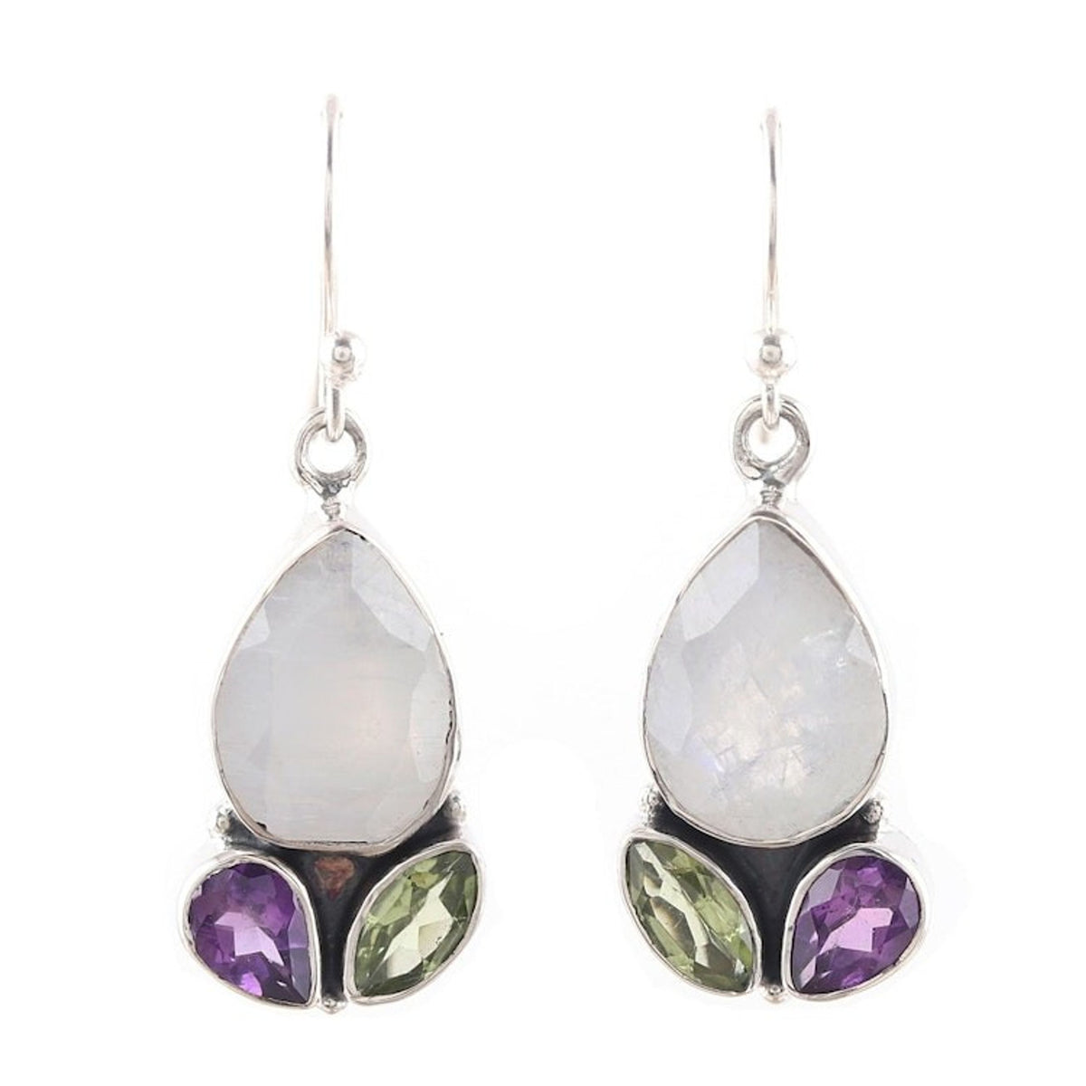 Handcrafted in India from 925 sterling silver, rainbow moonstone, peridot, and amethyst, with a combination finish. The earrings are 1.4 inches in length by 0.5 inches in width and feature a hook closure.