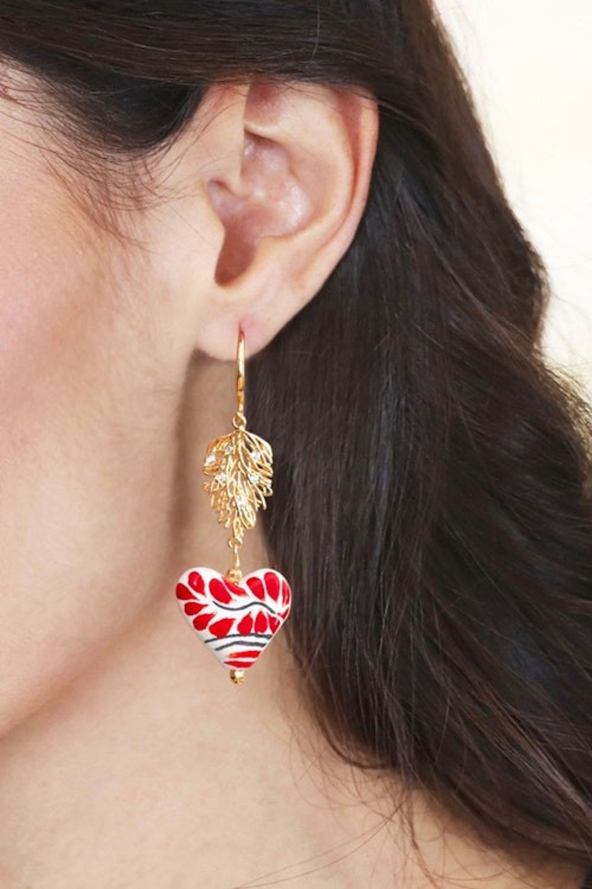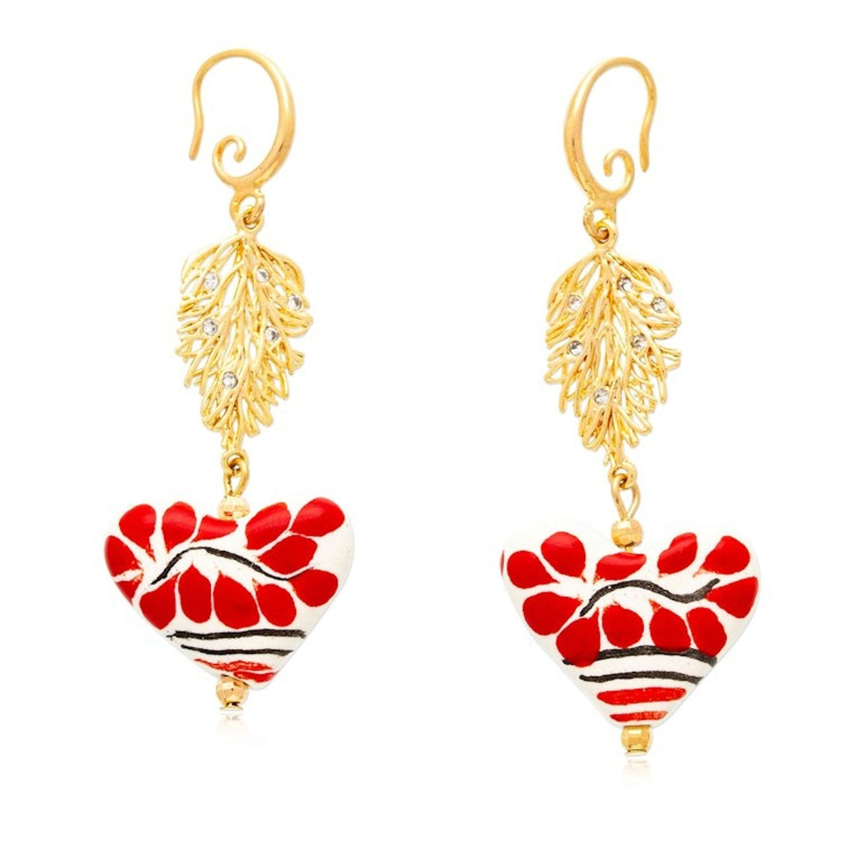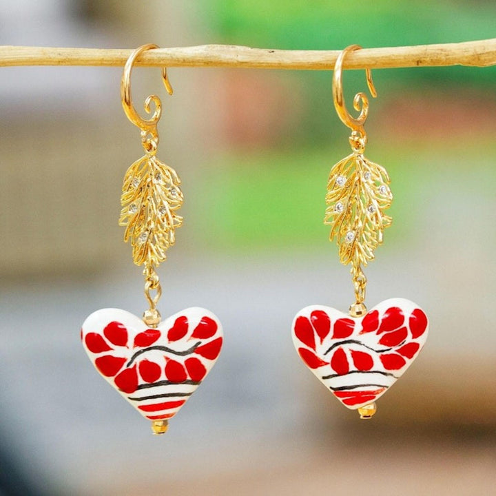 14k Gold-Accented Leaf Heart-Shaped Ceramic Dangle Earrings 'Talavera Romance'