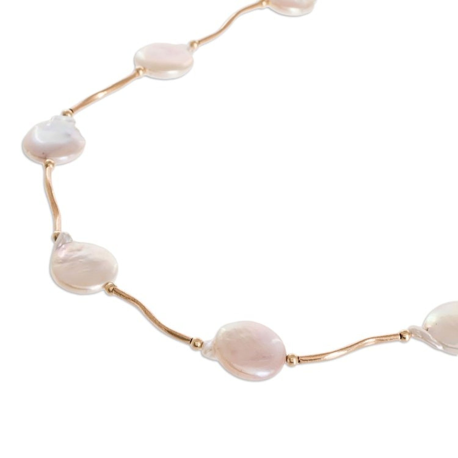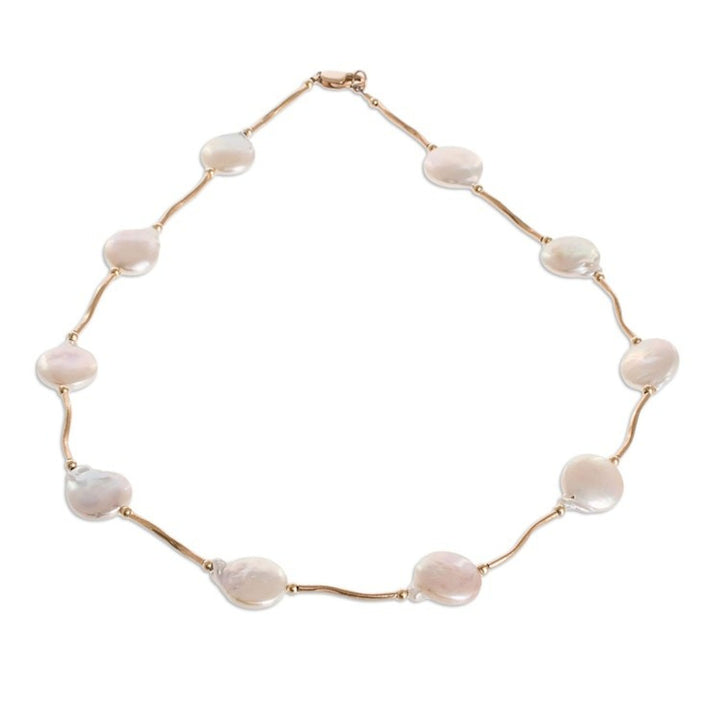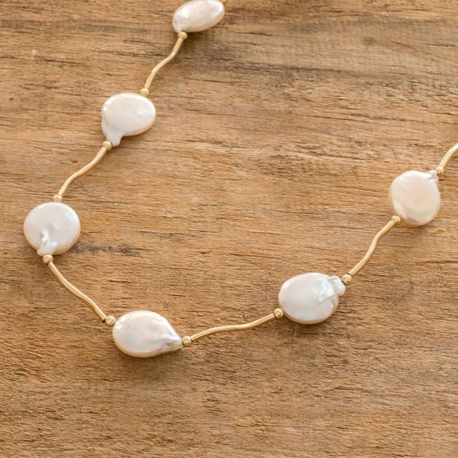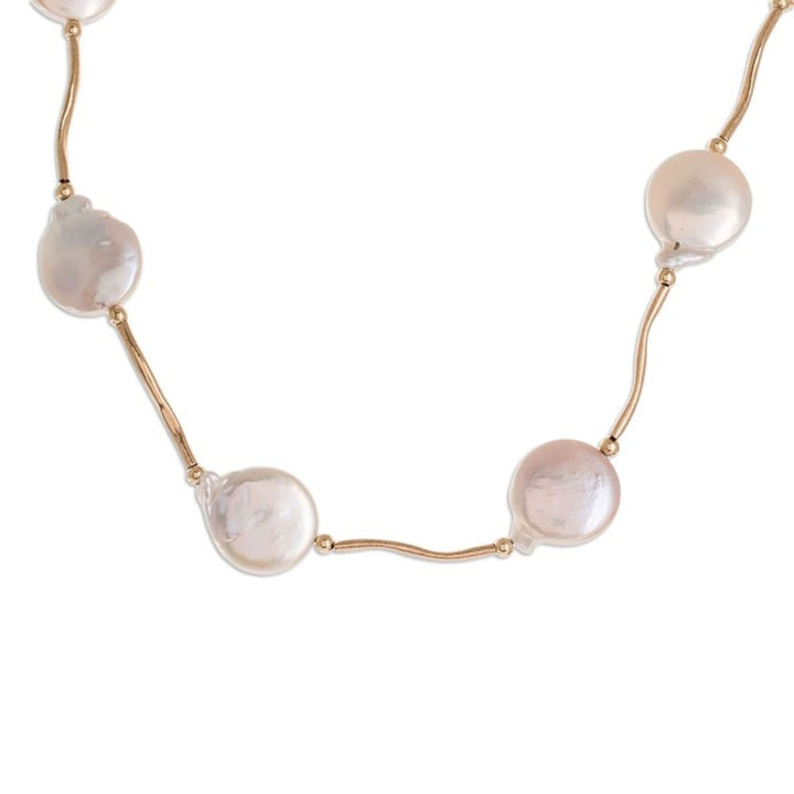 Handcrafted in Costa Rica from 14k gold filled links, cultured coin pearls, and stainless steel wire. The necklace measures 17 inches in length and 0.6 inches in width. It features a lobster claw clasp.
