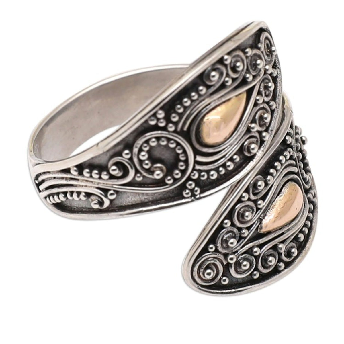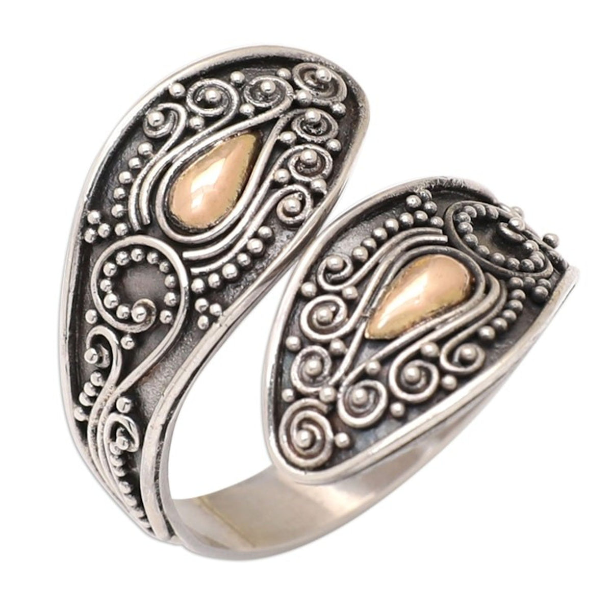 This 'Cobra Spirit' wrap ring by Nyoman Sukartini is a gorgeous accessory inspired by traditional Balinese jewelry. Crafted by local artisans, this sterling silver wrap ring features a cobra-like shape with intricate swirl motifs and little beads, adding a mystical touch. The sophisticated 18k gold-plated accents add a luxurious final touch, making it the perfect complement to any outfit. This piece reflects Nyoman Sukartini's commitment to honoring Bali’s cultural beauty and her role in uplifting her artisan community.