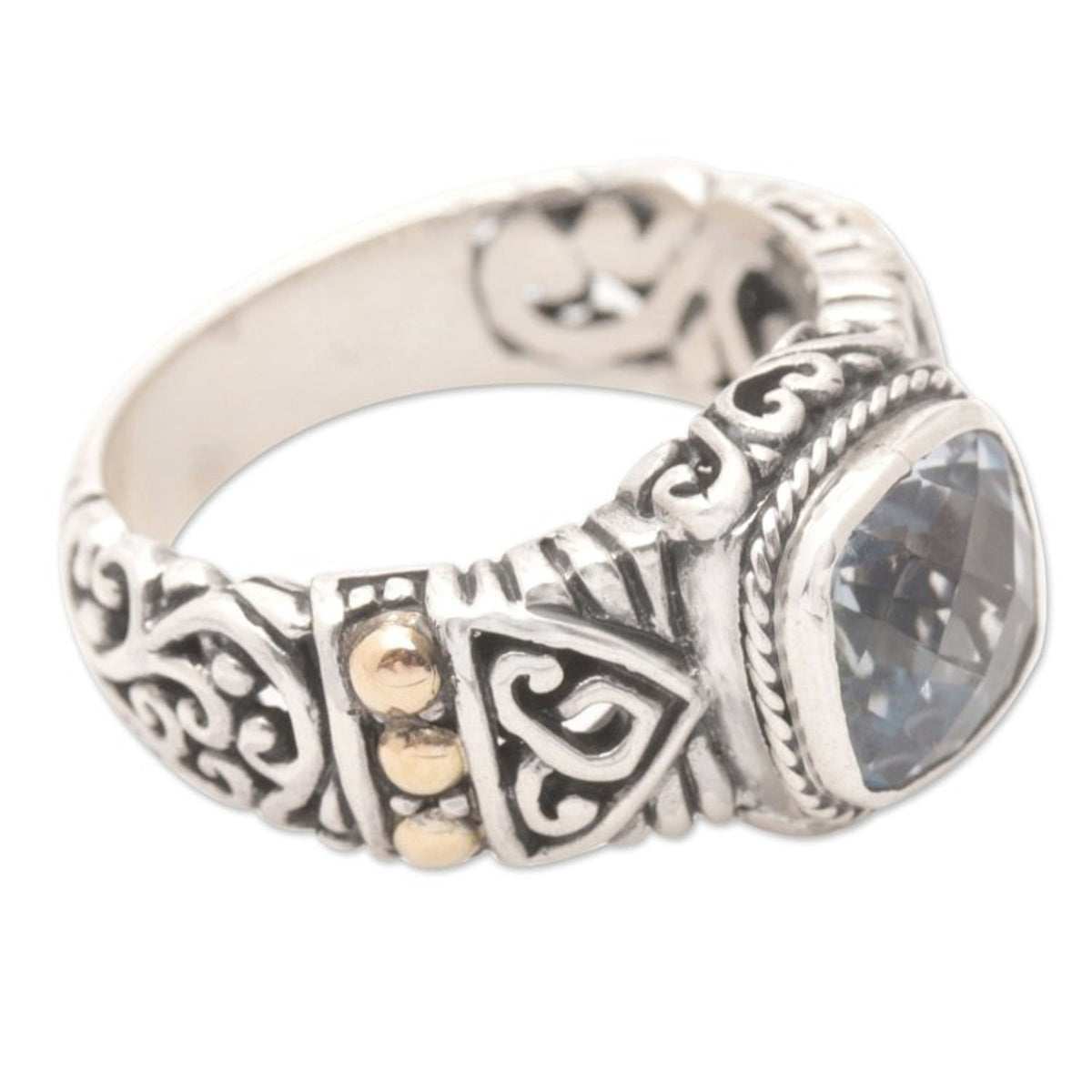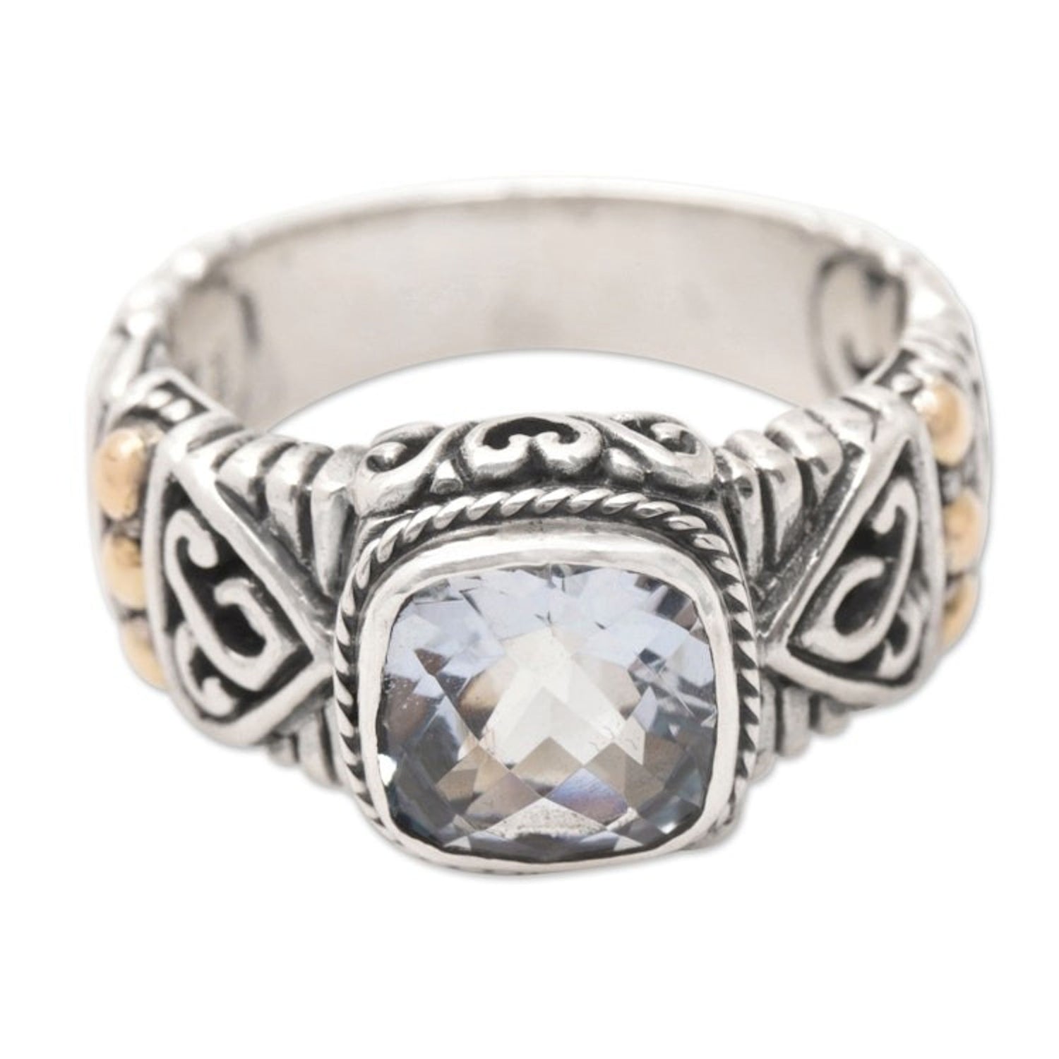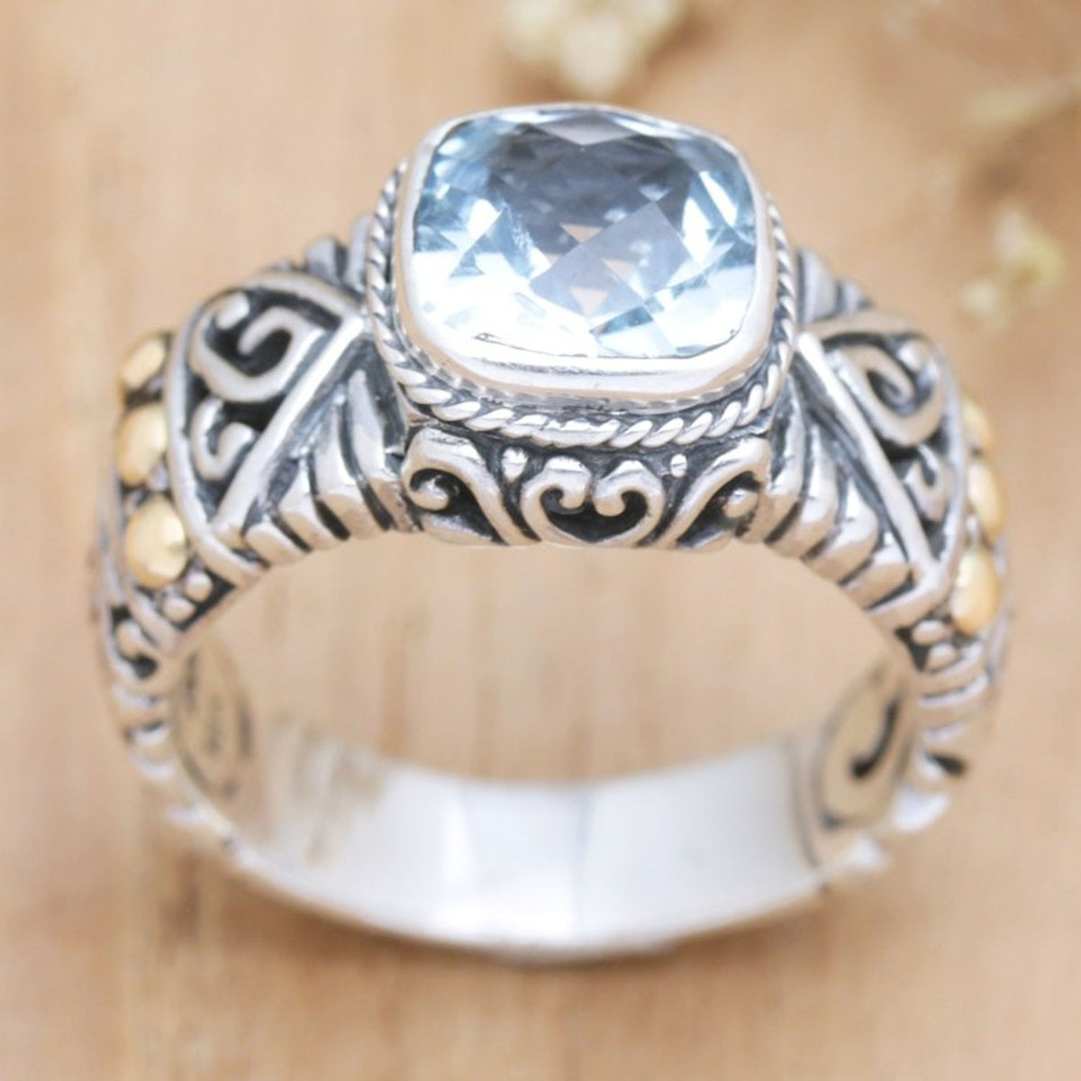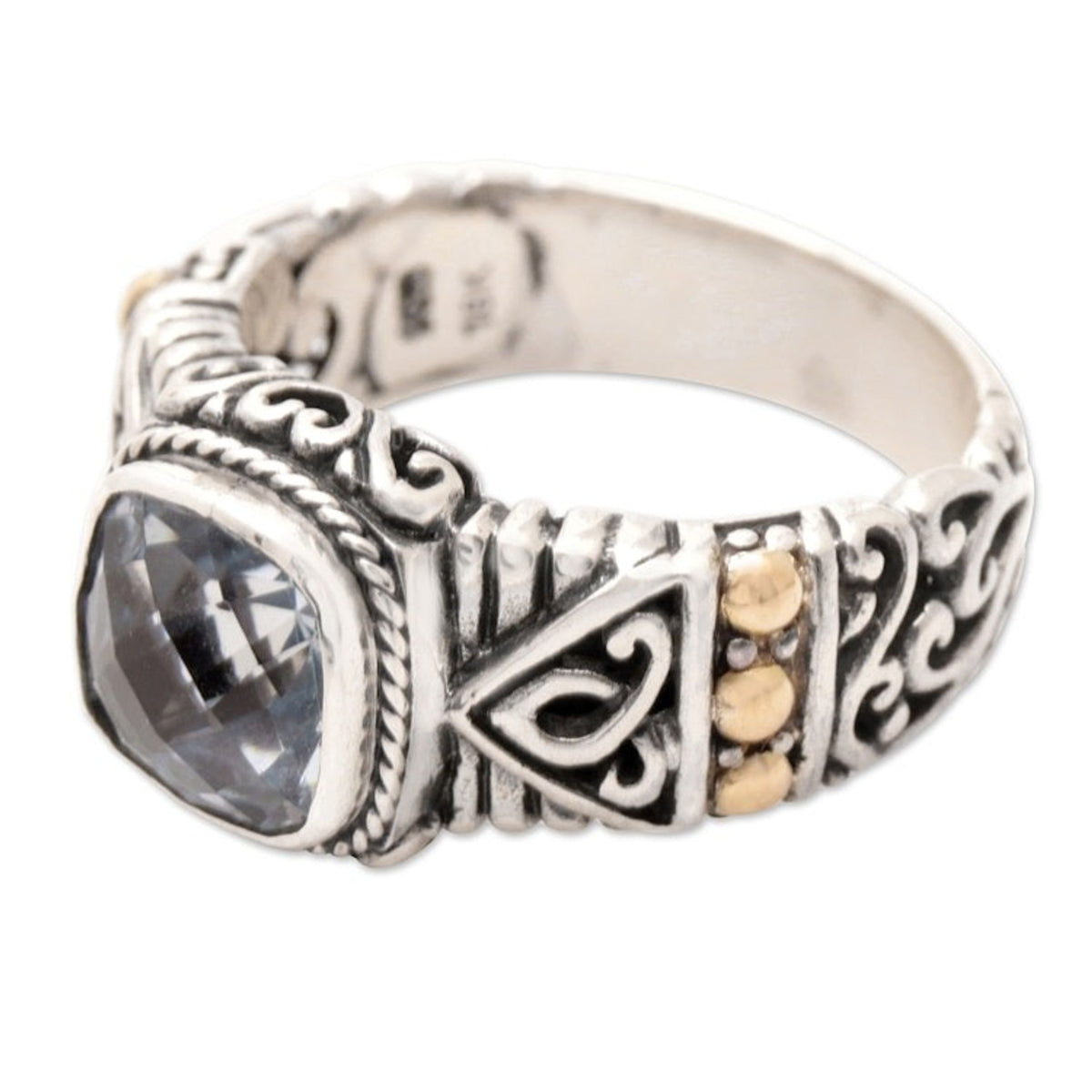 Handcrafted in Indonesia from 925 sterling silver, blue topaz, and 18k gold plate, with a combination finish. The ring's front measures 0.4 inches in length by 0.5 inches in width, with a band width of 5 mm.