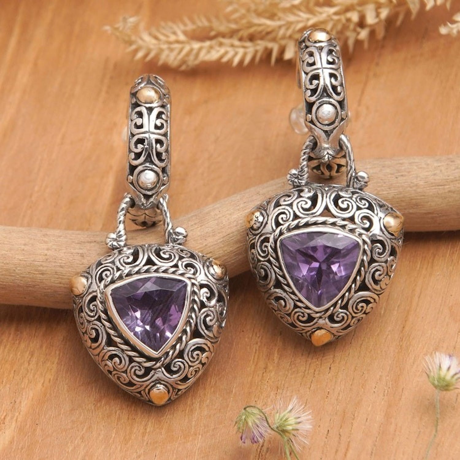 These 'Triangle of the Wise' dangle earrings by Dewi Putera are a glamorous and meaningful accessory. They feature a faceted amethyst stone in a triangle shape, which adds a beautiful purple glow and symbolizes wisdom. Crafted from sterling silver, the earrings are enhanced with traditional details and 18k gold-plated accents, which beautifully complement the gems. The total carat weight of the amethysts is over one carat, making this piece not only a work of art but a powerful talisman.