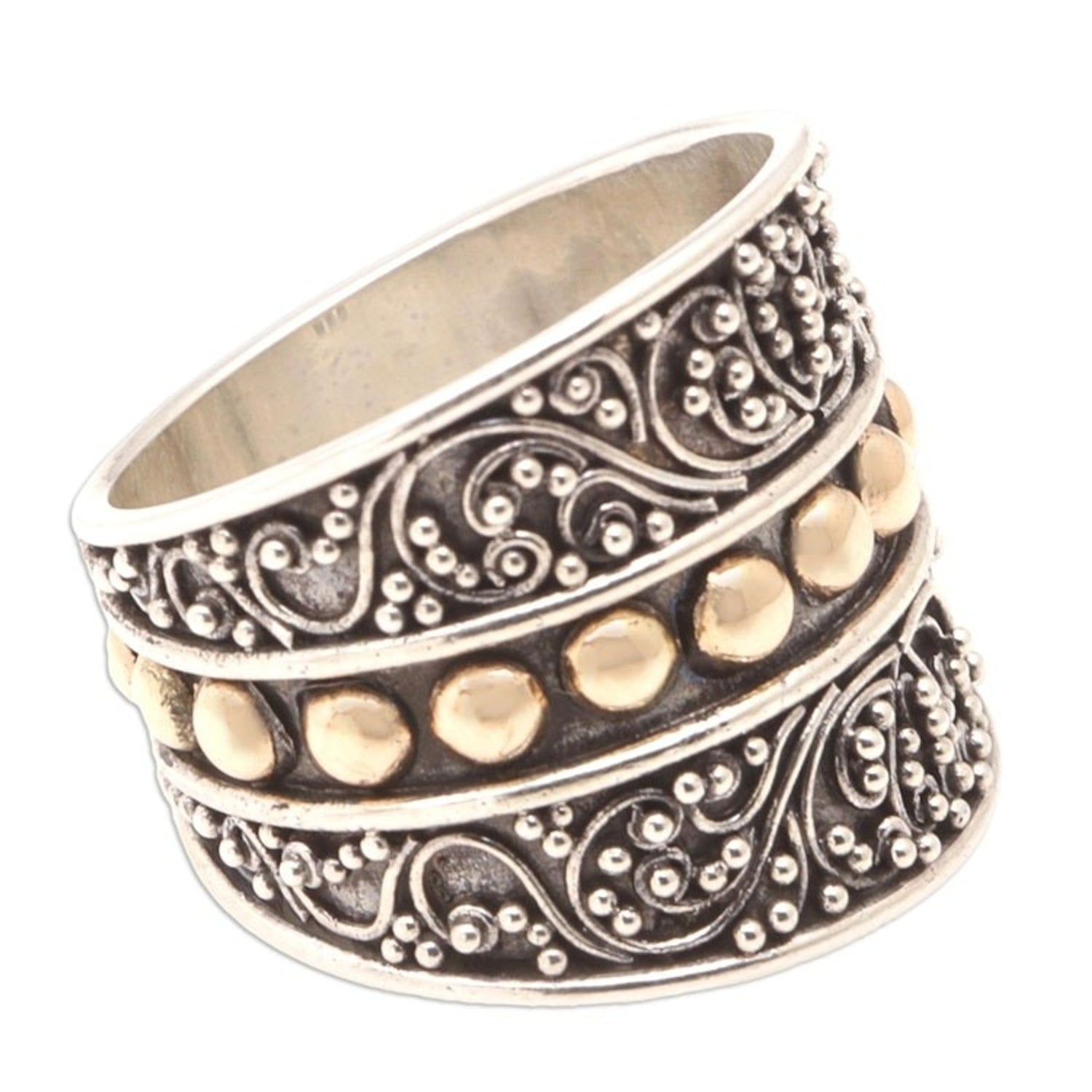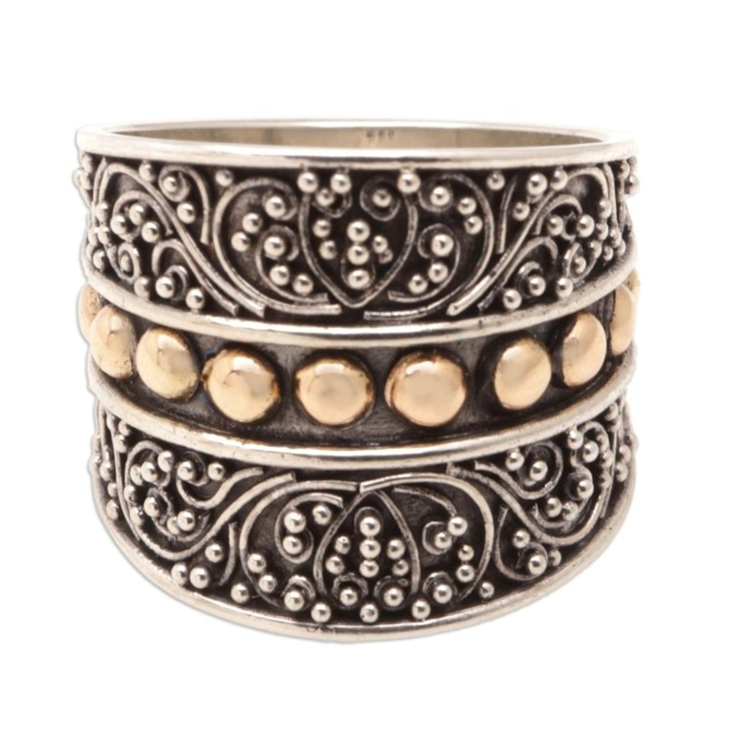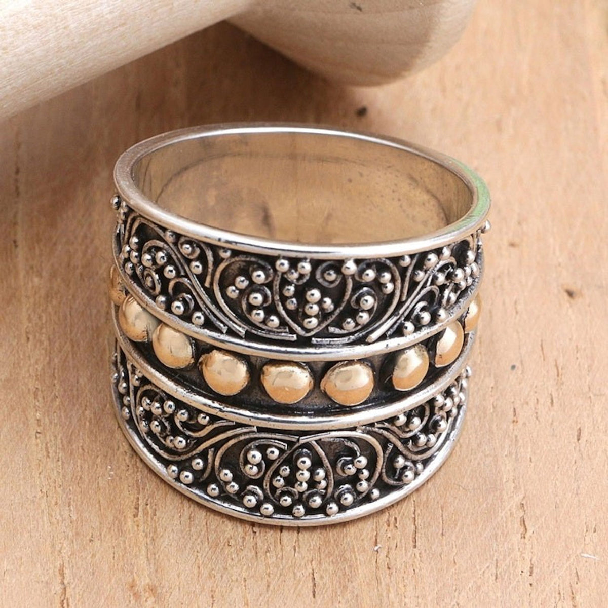 Handcrafted in Indonesia from 925 sterling silver and 18k gold plating, with a combination finish. The ring's band is 8 mm wide.