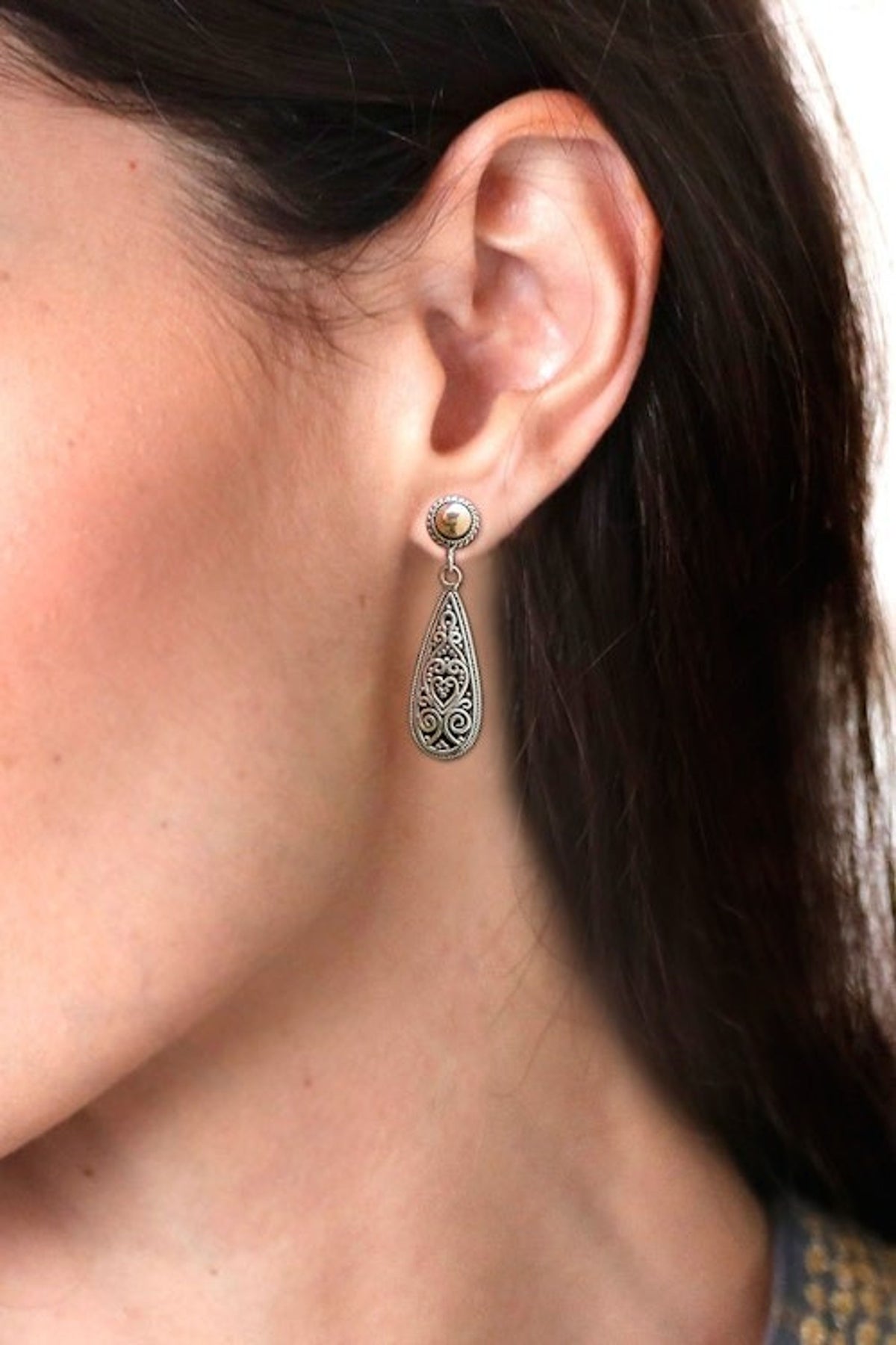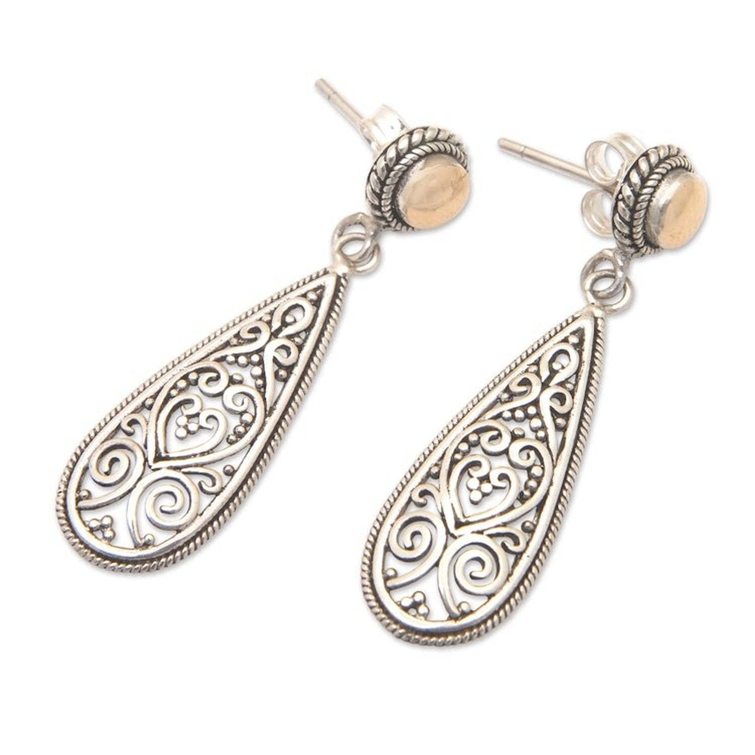 These 'Passion of Bali' dangle earrings by Made Suyana are a romantic and graceful creation. The design features drop-shaped sterling silver pieces that dance beautifully, each holding a heart-shaped detail. 18k gold-plated round pieces at the top add a touch of glamour, while intricate filigree motifs at the bottom create a delicate and romantic vibe. This accessory is a perfect blend of Balinese heritage and contemporary appeal, reflecting the artist's innovative approach to combining silver and gold.