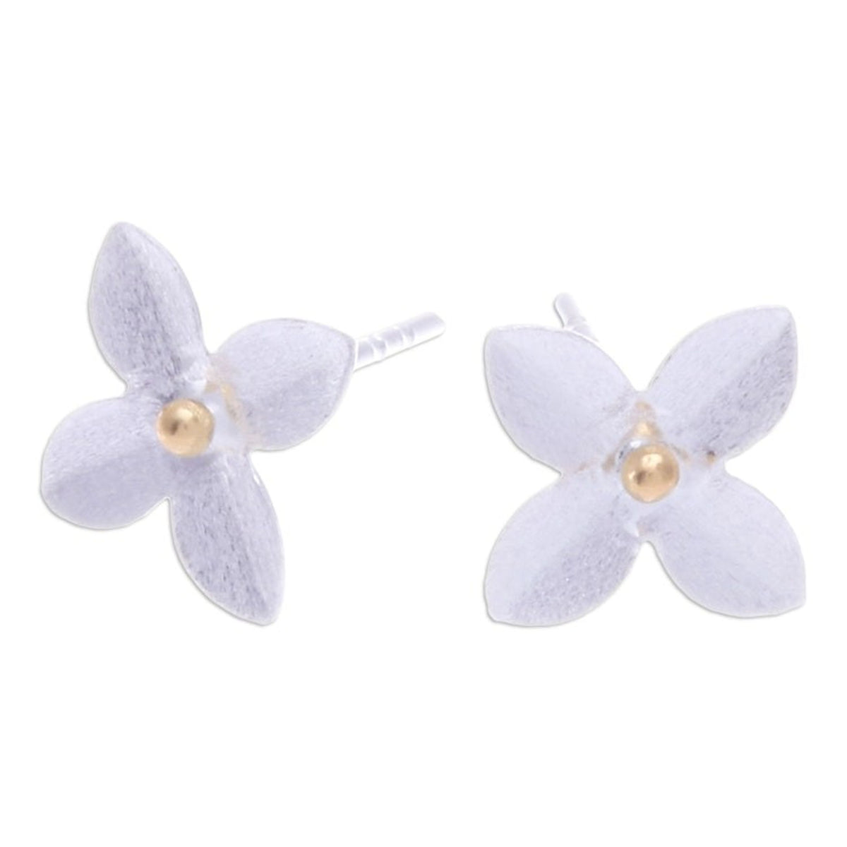 These 'Grace of Spring' button earrings by Lalana Thawiaphiradimani capture the ethereal beauty and glorious grace of Thailand's spring. The artisan uses sterling silver to create bloom-shaped earrings, whose petals are delicately enriched by petite 18k gold-plated accents. The combination finish adds depth and texture to the design. These earrings are a beautiful and meaningful accessory that reflects the artist's collaboration with Karen silversmiths, creating sustainable livelihoods and showcasing the beauty of community resilience.