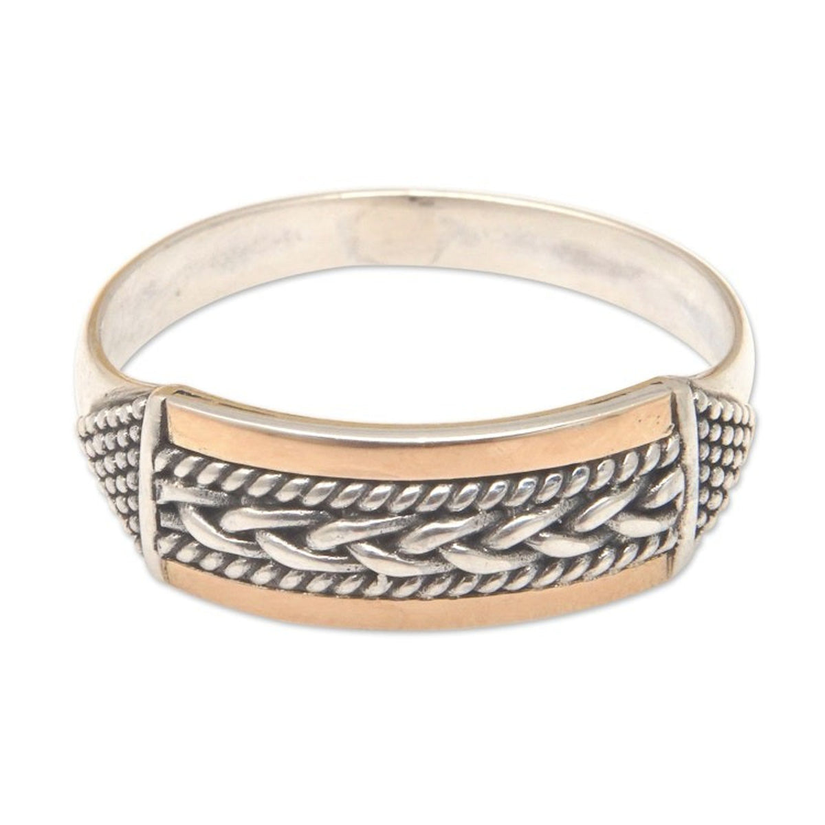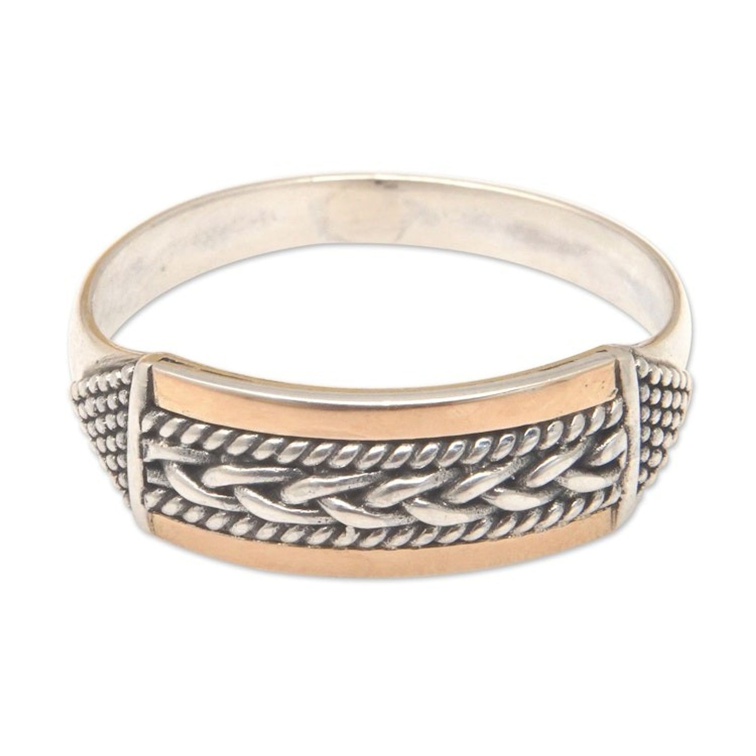 Handcrafted in Indonesia from 925 sterling silver and 18k gold plating, with a combination finish. The ring's front measures 0.7 inches in length by 0.2 inches in width, with a band width of 3 mm.