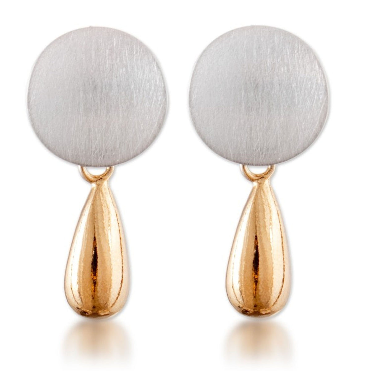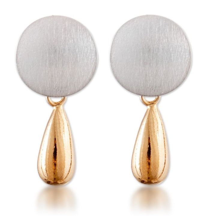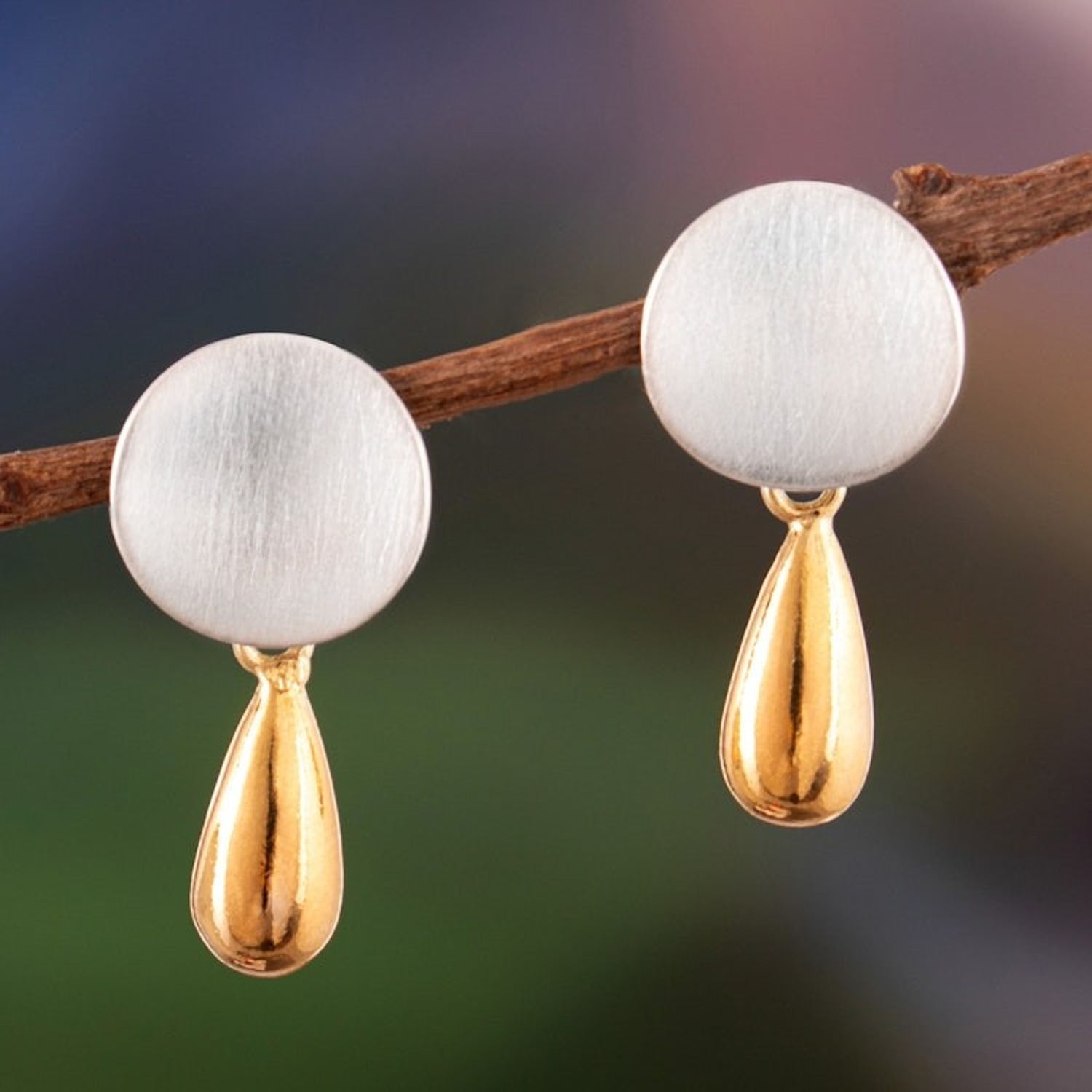 These 'Lunar Glint' dangle earrings by Silvia Garcia are a luxurious accessory inspired by the moon and the Andes region. The earrings feature the ethereal colors of sterling silver with 18k gold-plated drop-shaped pendants that add a touch of glamour. The combination finish creates a beautiful contrast, making this piece an ideal complement for any ensemble. This jewelry is a personal expression of the artist's creativity and a celebration of Peru’s enduring tradition of handcrafted art.