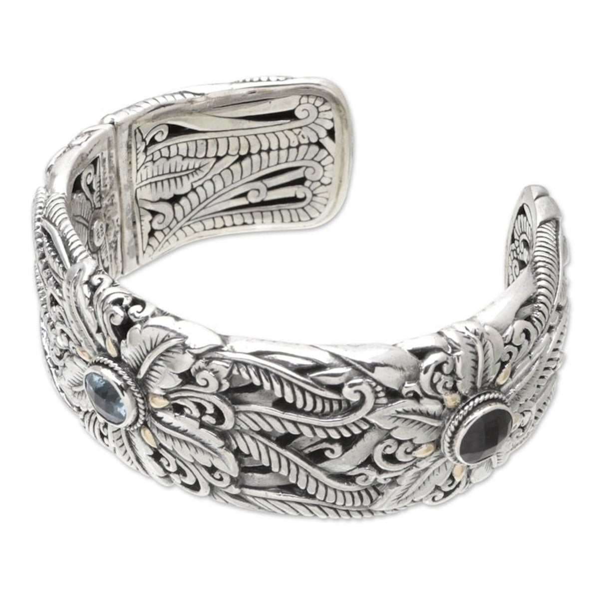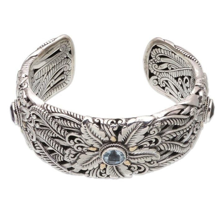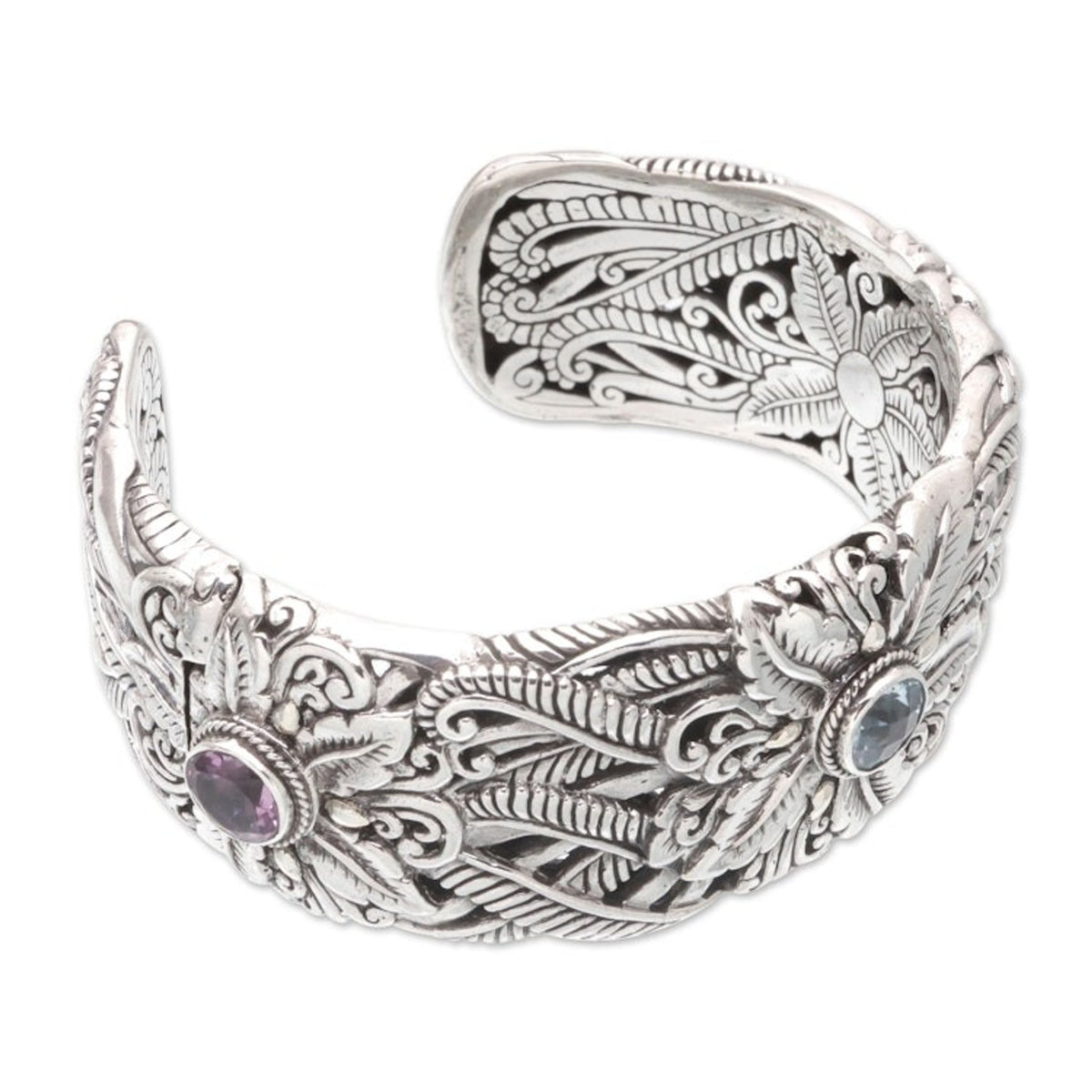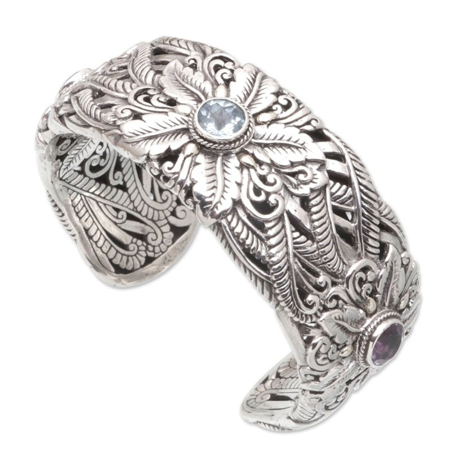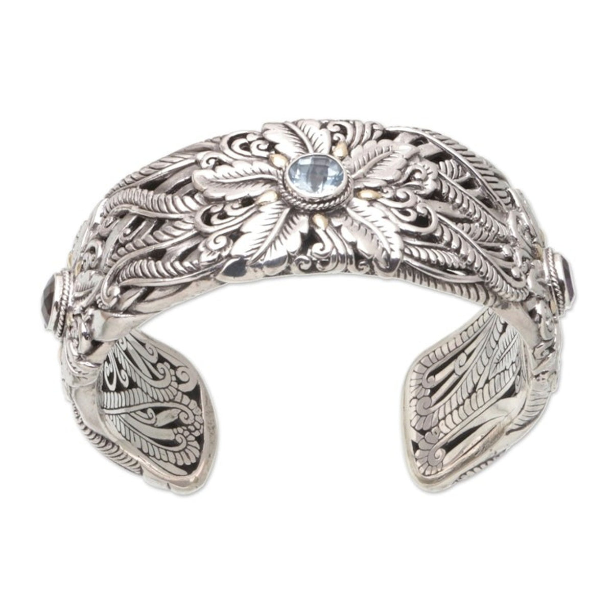Handcrafted in Indonesia from 925 sterling silver, blue topaz, garnet, amethyst, and 18k gold accents, with a combination finish. The cuff measures 6.3 inches in length (end to end) and 1.1 inches in width.