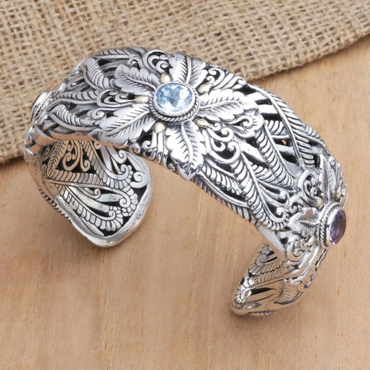 This 'Floral Blessing' cuff bracelet by Dewi Putera is a captivating creation inspired by Bali's nature. It features floral motifs and is crowned with amethyst, blue topaz, and garnet stones totaling four carats. A combination finish enhances the beauty of each little detail, and 18k gold accents add a luminous touch. This bracelet is a beautiful blend of traditional craftsmanship and natural inspiration, offering a piece that is both stylish and meaningful, and that shares the spirit of Bali with the world.