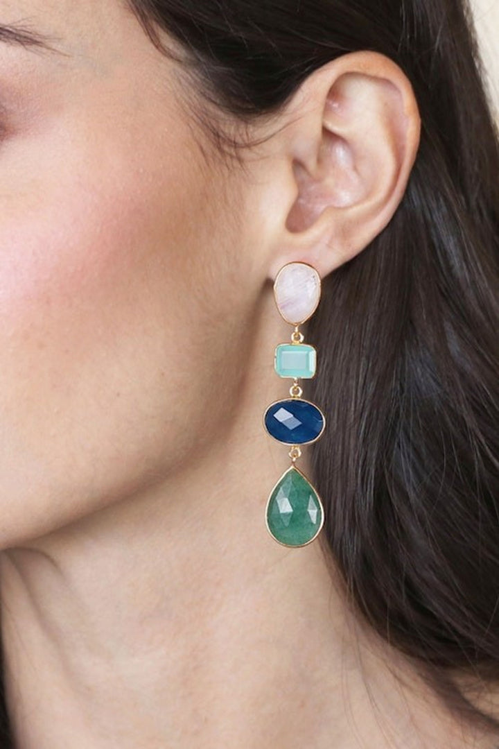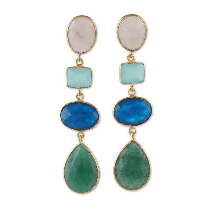 Handcrafted in India from 18k gold-plated 925 sterling silver, rainbow moonstone, quartz, aventurine, and chalcedony, with a high polish finish. The earrings are 2.6 inches in length by 0.6 inches in width and feature a post-back closure.