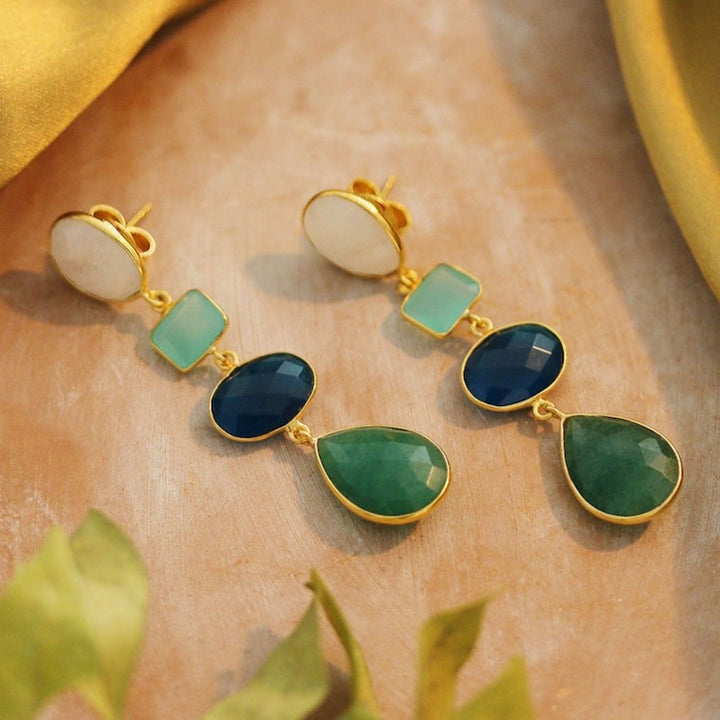 These 'Dazzling Quartet' dangle earrings by Neetu Barathi are a stunning creation inspired by the enchanting colors of an ethereal lagoon. Crafted from 18k gold-plated sterling silver, the earrings feature a radiant look complemented by faceted rainbow moonstone, quartz, aventurine, and chalcedony jewels. The combination of cuts and the high polish finish create a captivating design. The gems total 63 carats, making this accessory a bold and luxurious statement piece that celebrates nature's vibrant beauty.