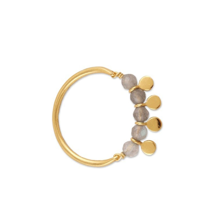 Handcrafted in India from 18k gold-plated 925 sterling silver and labradorite, with a high polish finish. The ring's front measures 0.1 inches in length by 0.6 inches in width, with a band width of 1 mm.