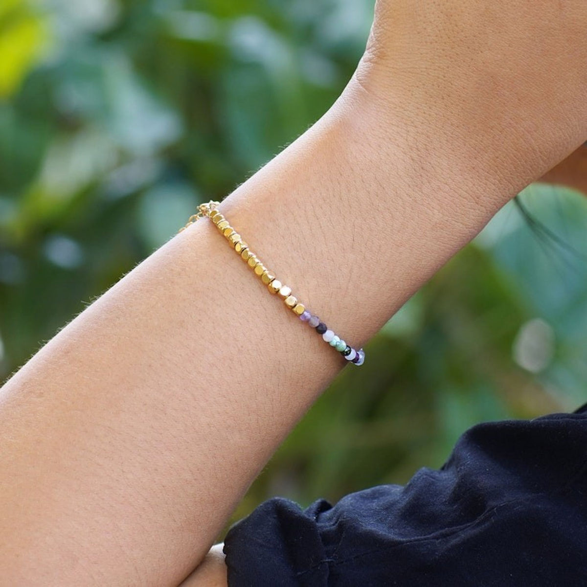 Handcrafted in Indonesia from 18k gold-plated brass and fluorite, with a high polish finish. The adjustable bracelet measures between 6.3 and 8.3 inches in length and features a lobster claw clasp.