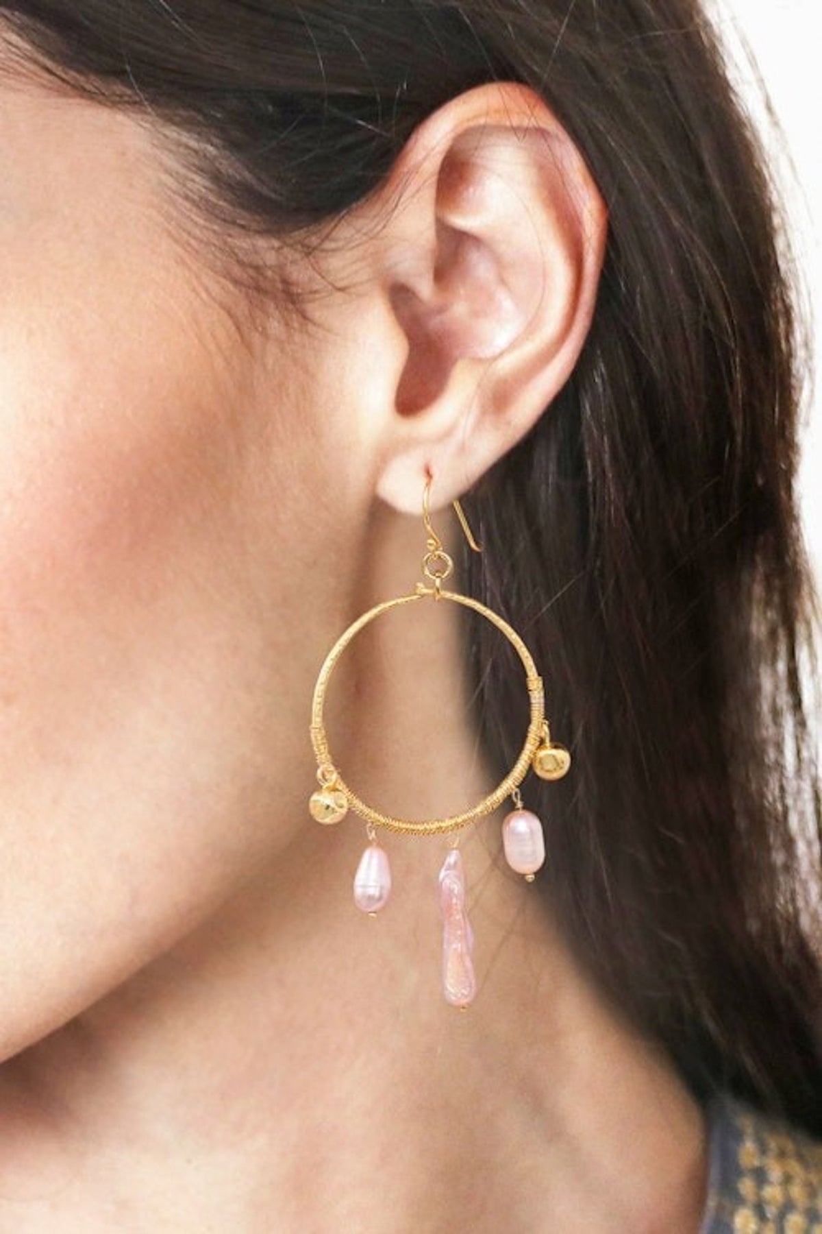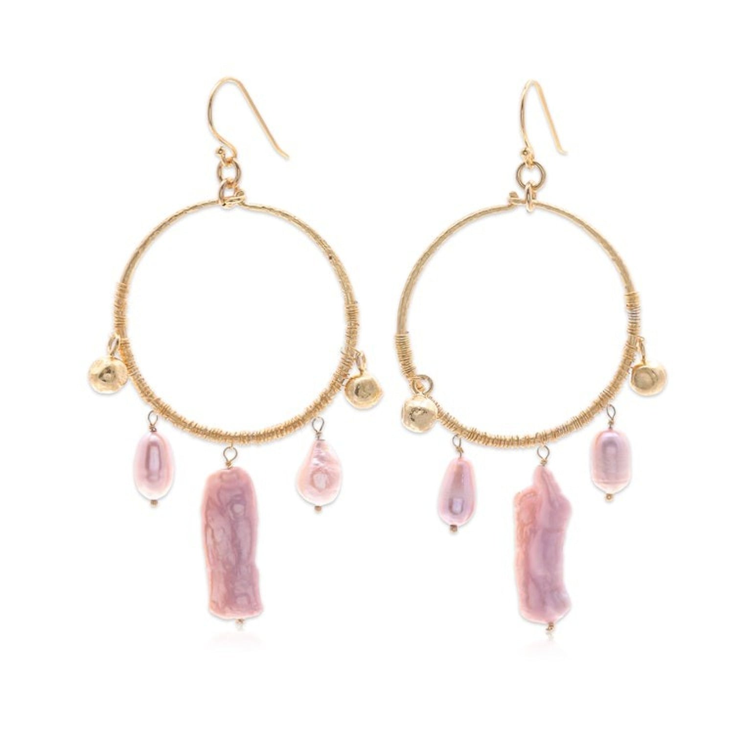 These 'Pop of Pink' statement chandelier earrings by Saranarat Ratanaporn are a luxurious and bold accessory. The gold-plated earrings feature a mesmerizing symphony of vibrant cultured pearls that gracefully sway from round frames. These statement-making accessories transform any outfit from ordinary to extraordinary, promising to draw every gaze. This piece reflects the artist's passion for design and her ability to create intricate, wearable art that is inspired by fashion trends yet rooted in the timeless allure of gemstones.