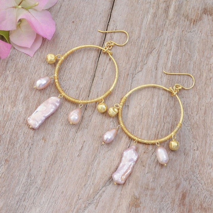 Handcrafted in Thailand from 18k gold-plated 925 sterling silver and freshwater cultured pearls, with a combination finish. The earrings are 3.1 inches in length by 1.6 inches in width and feature a hook closure.