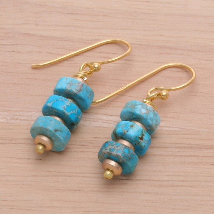 Handcrafted in Thailand from reconstituted turquoise, hematite, and 18k gold-plated 925 sterling silver, with a high polish finish. The earrings are 1.3 inches in length by 0.3 inches in width and feature a hook closure.