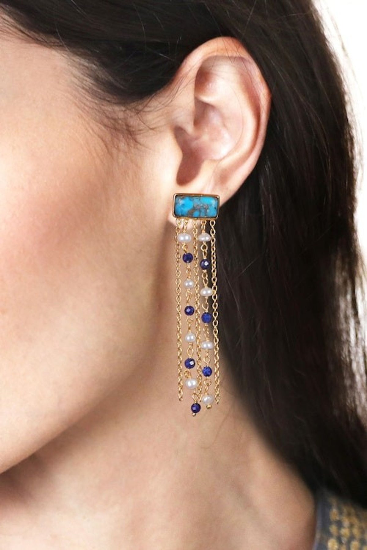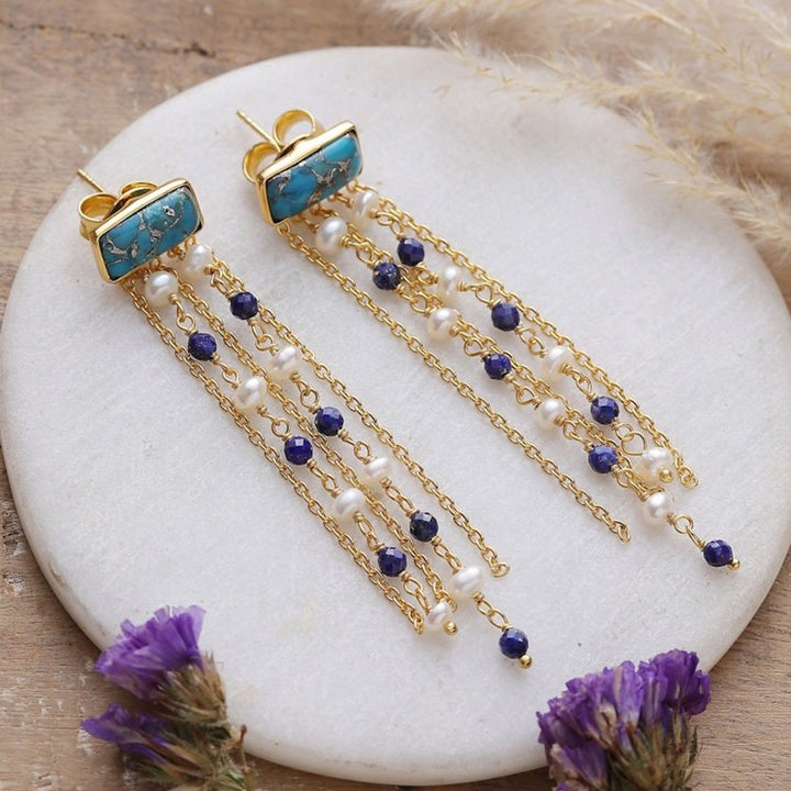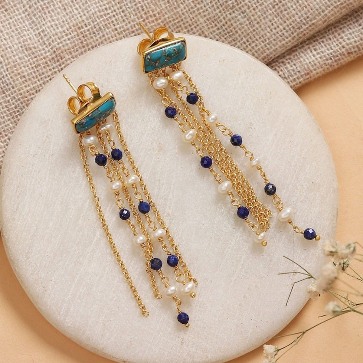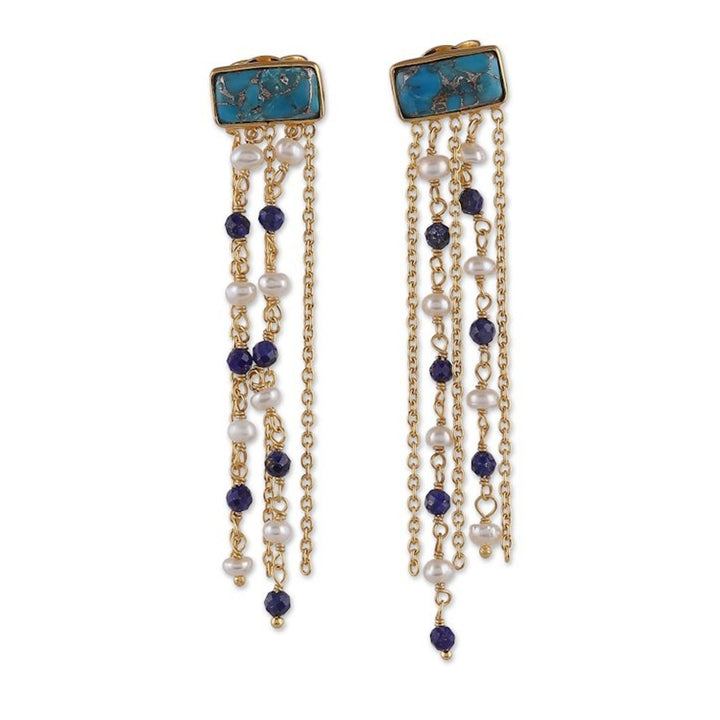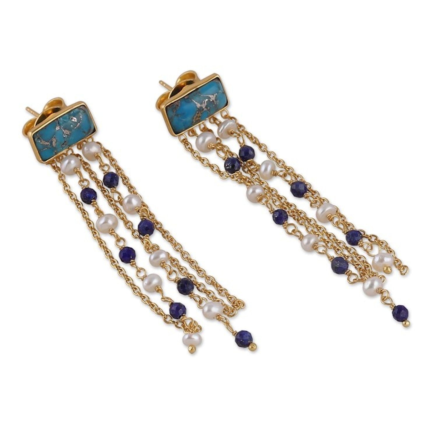 Handcrafted in India from 18k gold-plated 925 sterling silver, composite turquoise, lapis lazuli, and cultured pearls, with a high polish finish. The earrings are 2.7 inches in length by 0.5 inches in width and feature a post-back closure.